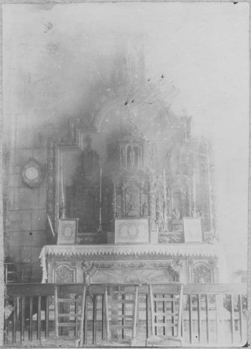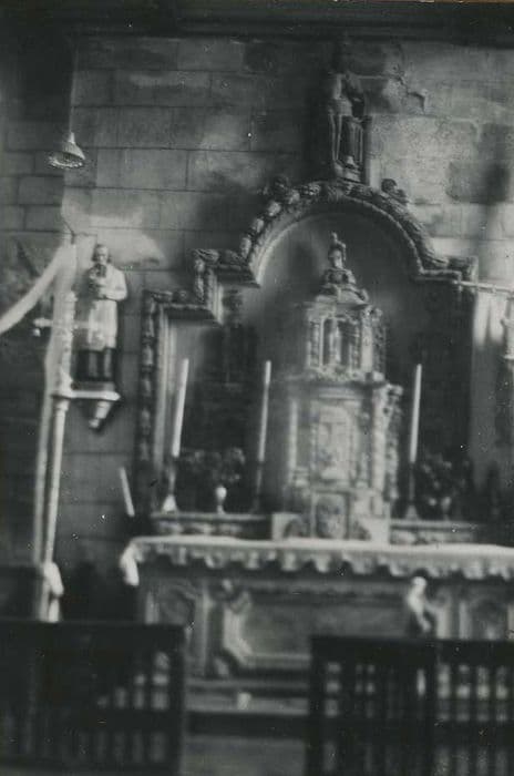Retable composé d'une partie centrale en avancée comprenant deux étages à trois niches, flanquée de chaque côté par deux niches superposées. Des colonnettes enroulées de feuillages séparent les niches. Le tout est entouré d'un cadre de moulures ornées de feuillages et de rubans, qui se termine par un fronton en plein-cintre.