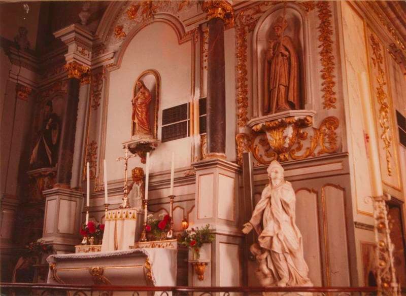 Retable Sud identique au retable Nord. grand tableau central encadré de deux colonnes. Ailes droite et gauche ornées de niches contenant des statues. Le tabernacle est surmonté de la monstrance.