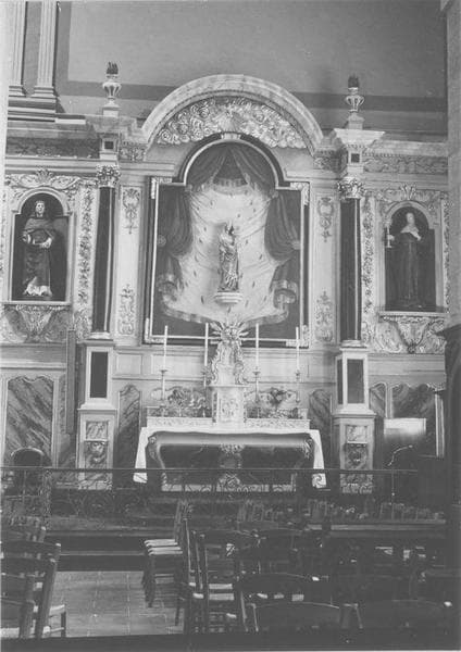 Retable Nord identique au retable Sud. grand tableau central encadré de deux colonnes. Ailes droite et gauche ornées de niches contenant des statues. Le tabernacle est surmonté de la monstrance.