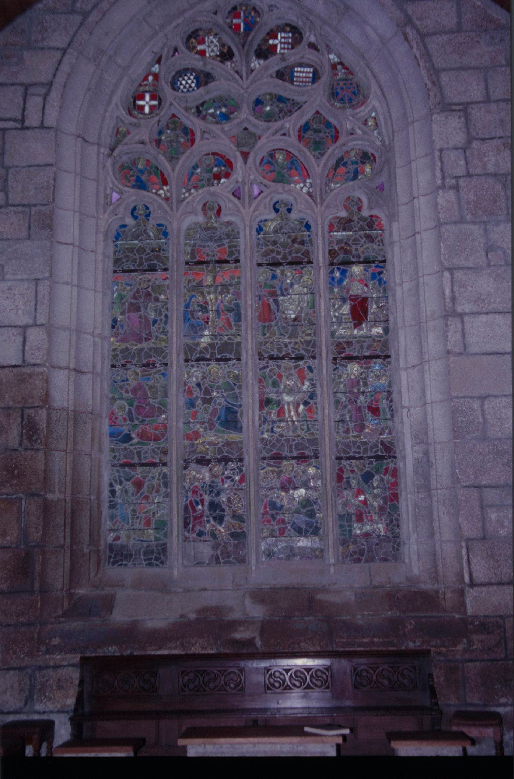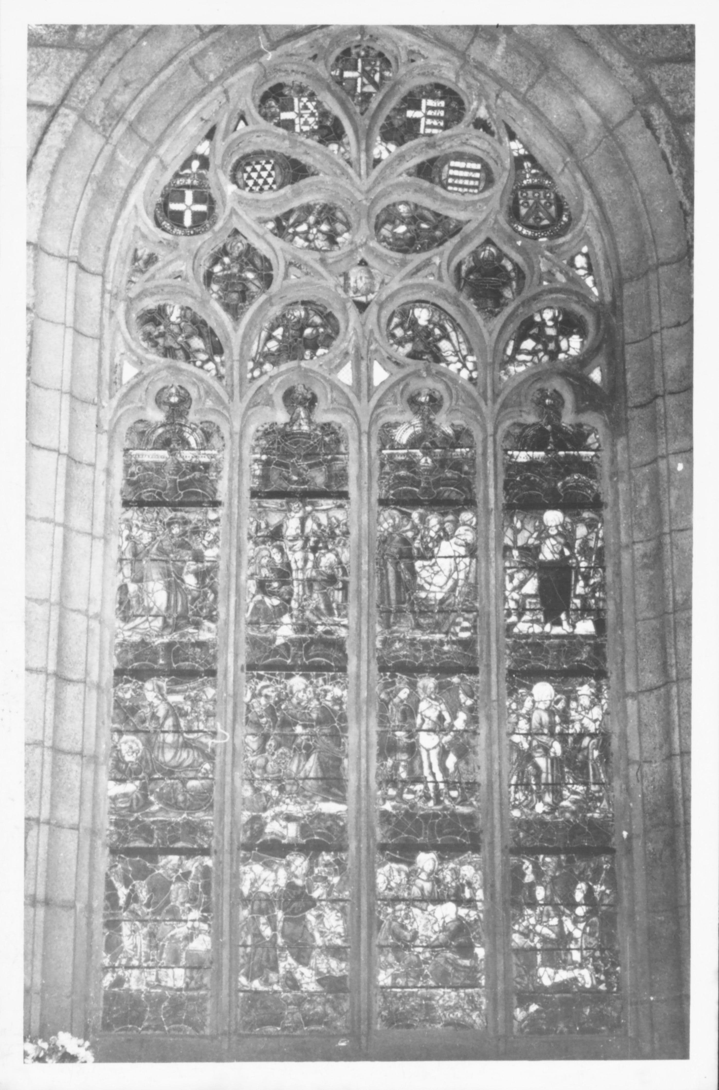 verrière : le Portement de croix, la Crucifixion, la Mise au tombeau, la Résurrection, l'Agonie, le Baiser de Judas, la Flagellation, Jésus devant Pilate, saint Pierre avec un donateur et une donatrice, les Rameaux, la Cène, saint Paul avec un donateur et une donatrice, ange