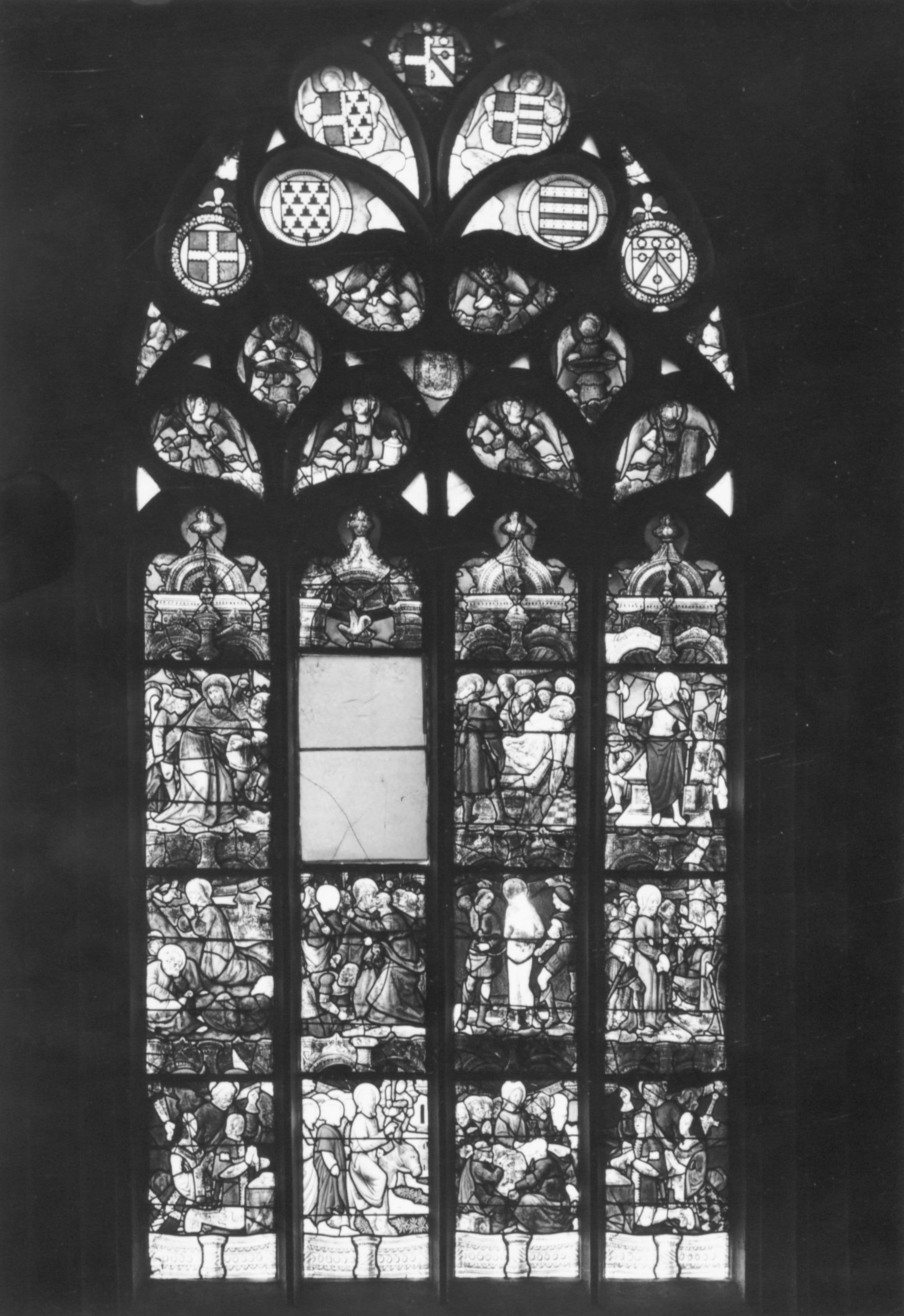 POP | Plateforme ouverte du patrimoineverrière : le Portement de croix, la Crucifixion, la Mise au tombeau, la Résurrection, l'Agonie, le Baiser de Judas, la Flagellation, Jésus devant Pilate, saint Pierre avec un donateur et une donatrice, les Rameaux, la Cène, saint Paul avec un donateur et une donatrice, ange