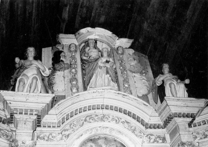 Retable à deux étages. Au premier étage, un gradin avec au centre le tabernacle, le panneau central avec un tableau encadré de deux colonnes, un entablement curviligne. ailes en retour comportant chacune une console pour les statues. Au deuxième étage, une niche centrale avec fronton curviligne, encadrée de deux angelots d'où partent des chutes de fleurs et de fruits.