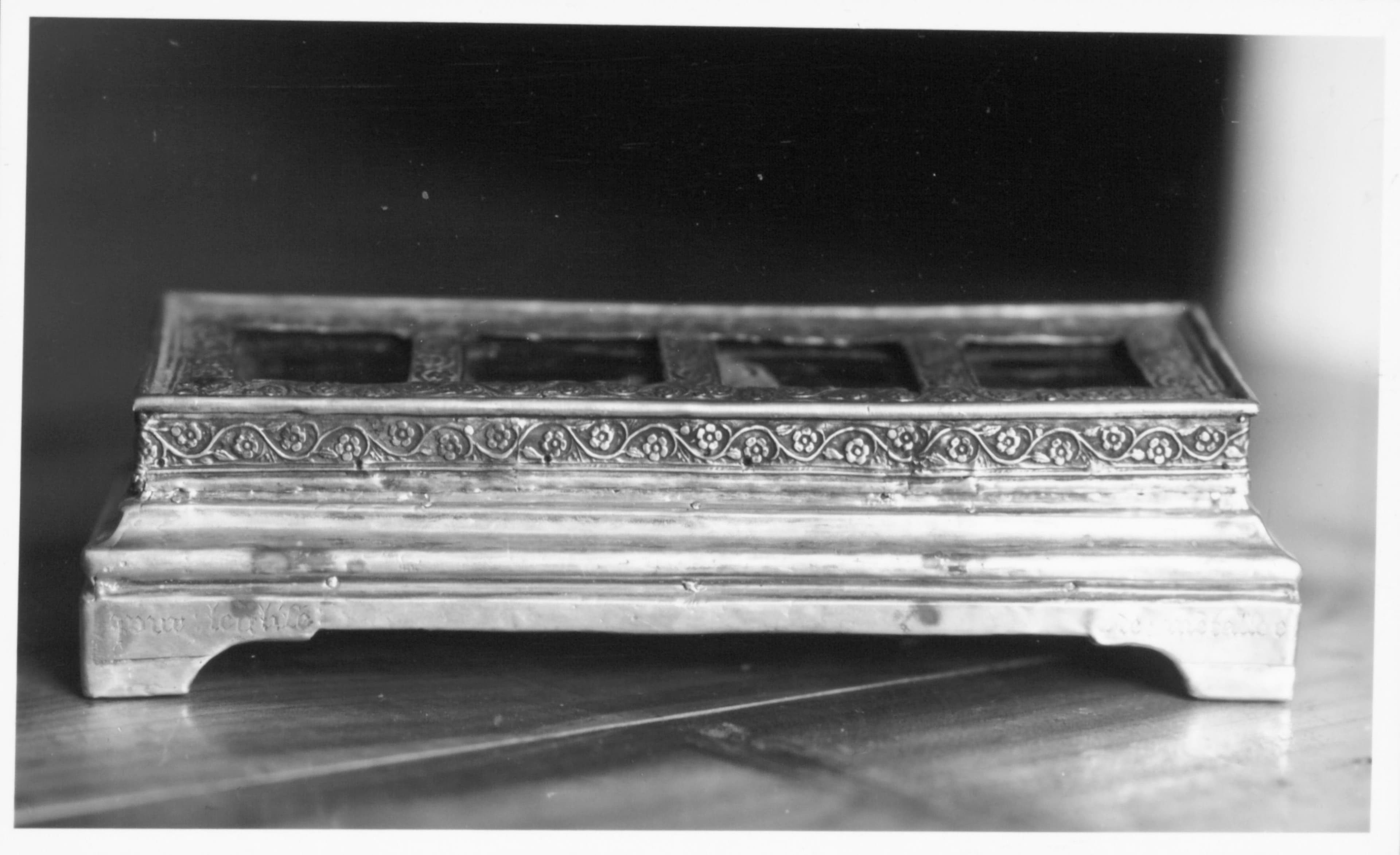 Base rectangulaire moulurée portée par quatre pieds. Le rebord du reliquaire est décoré de guirlandes de fleurettes. Le dessus est divisé en cinq compartiments vitrés.