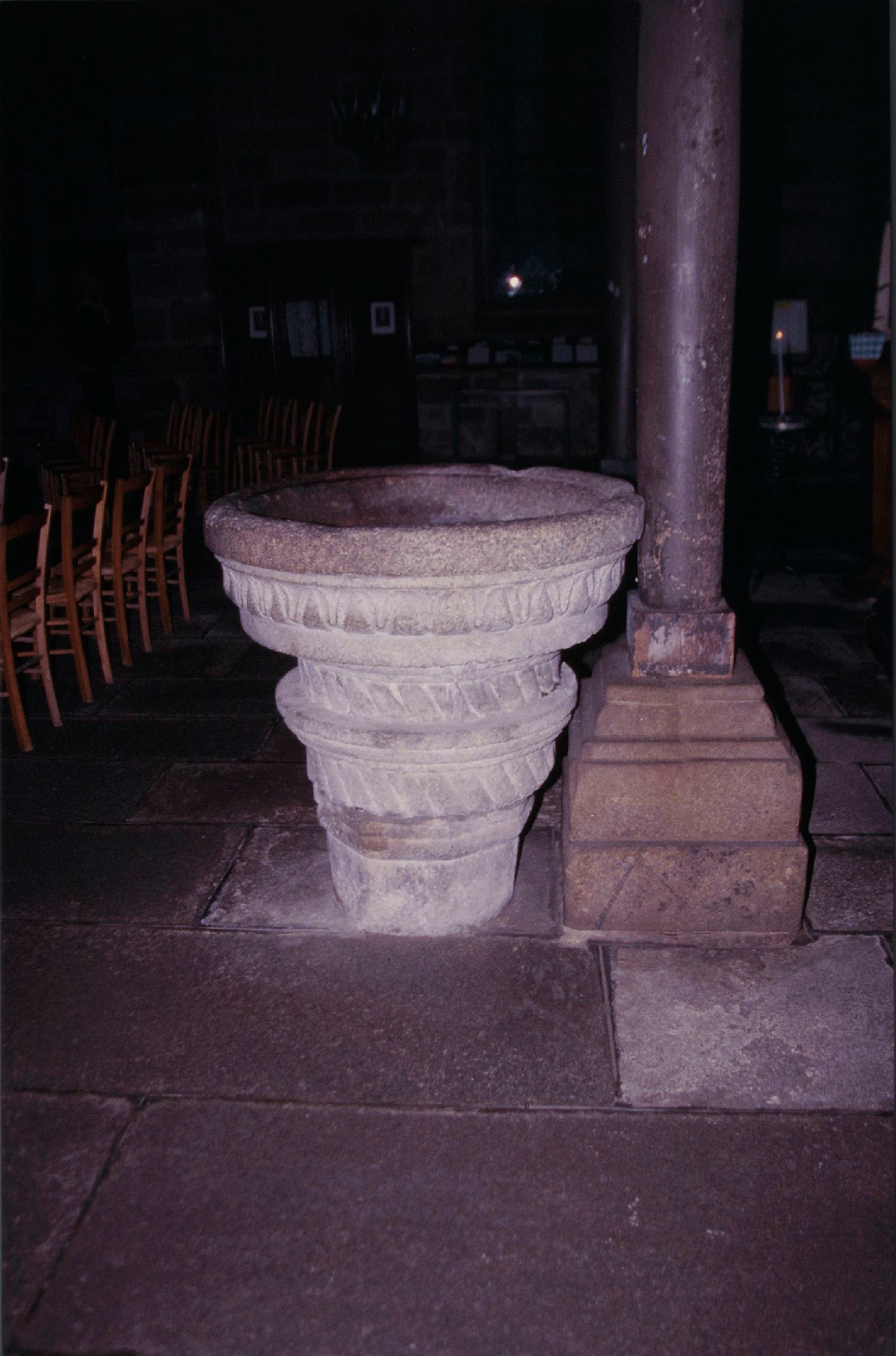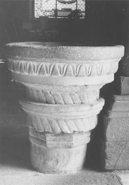 Le bassin est décoré d'une frise de lambrequins et d'un faisceau de godrons elliptiques ceinturé d'une grosse moulure. Le socle est une petite colonne cylindrique surmontée de deux moulures octogonales.