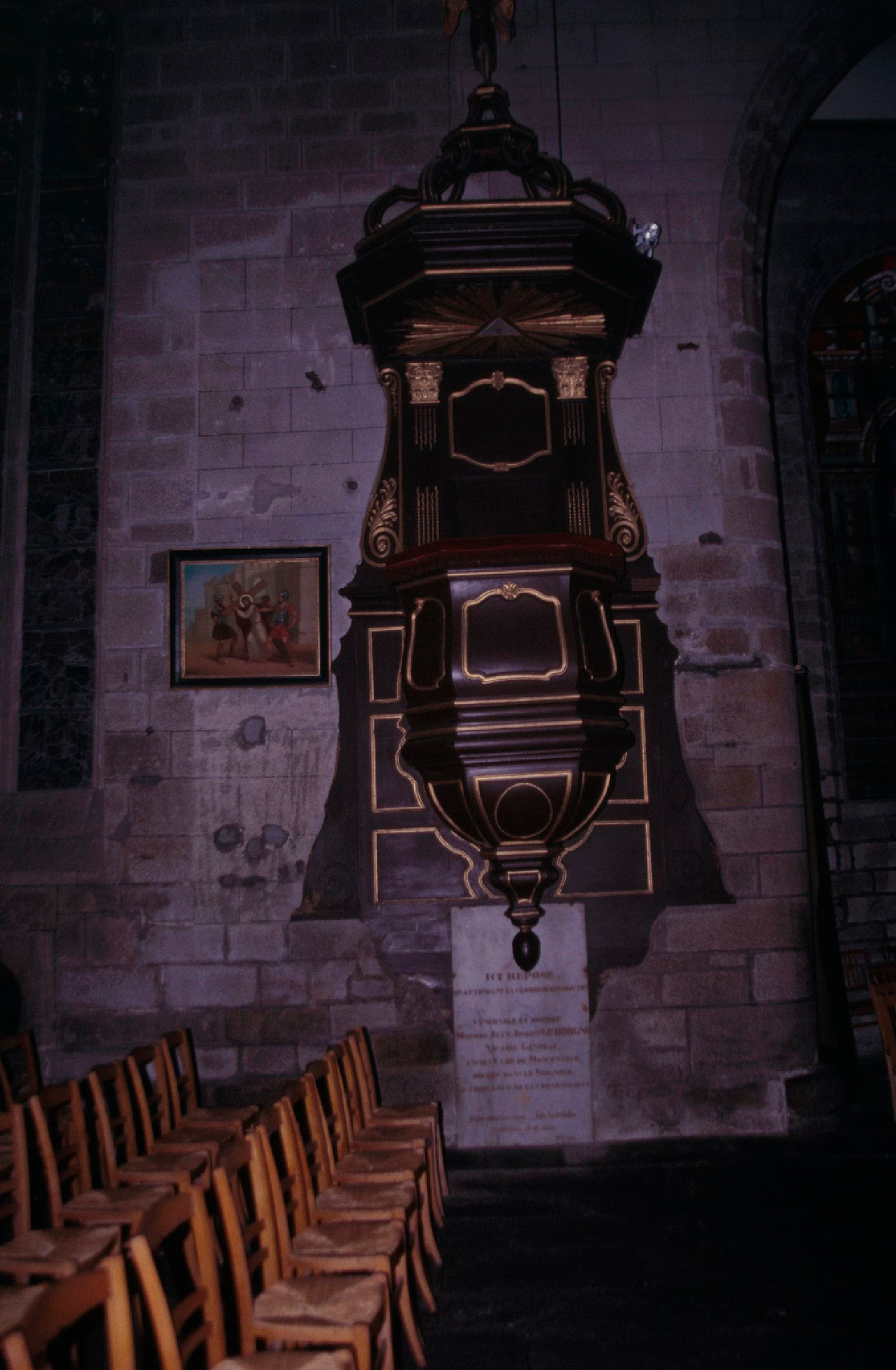 Chaire accrochée au mur, sans escalier apparent. Cuve galbée présentant une série de petits panneaux. Le dossier comprend deux pilastres cannelés à chapiteaux corinthiens, un panneau central et deux ailerons. L'abat-voix est couronné d'un amortissement avec ange.