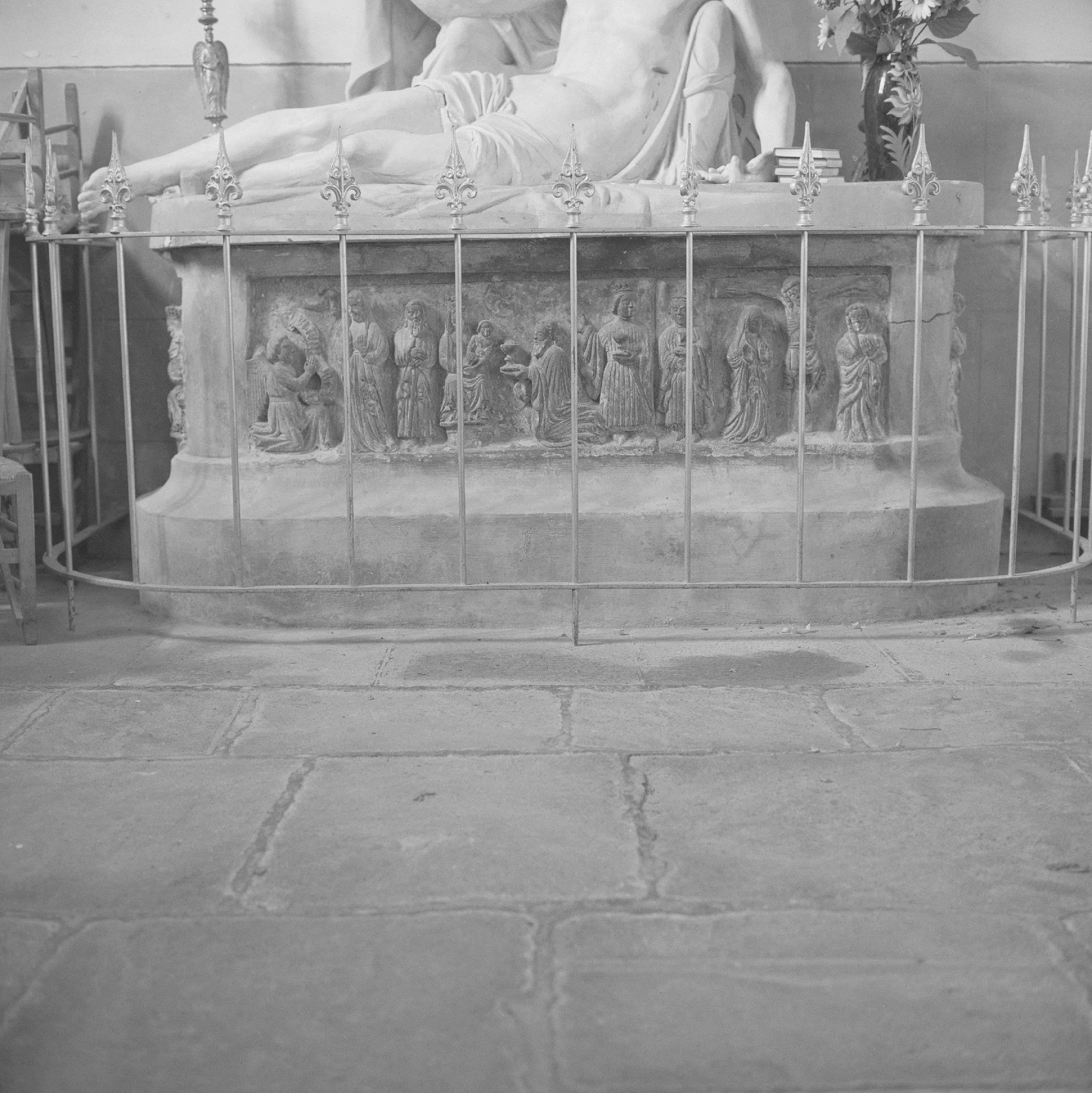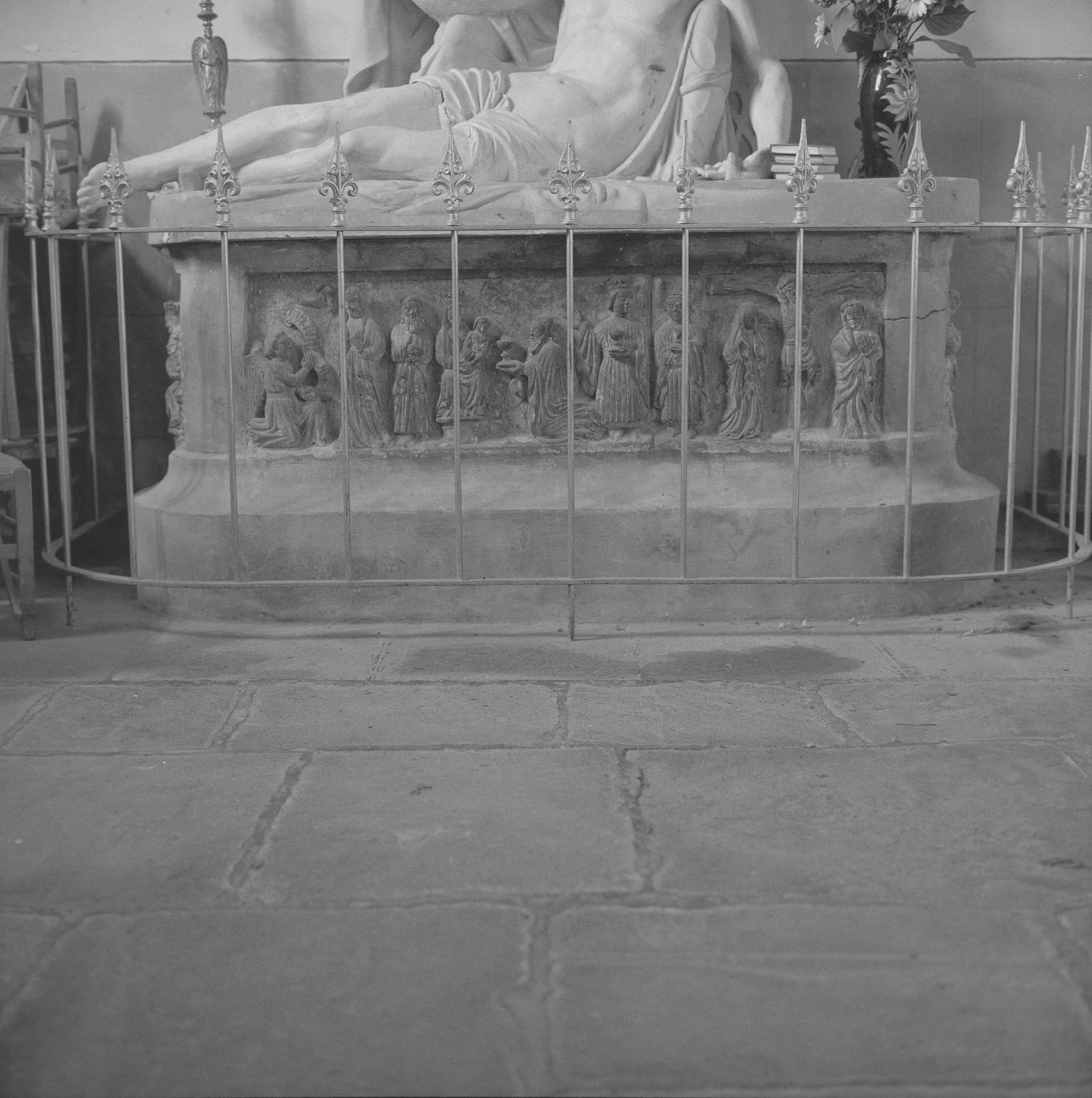 Retable en granit de Kersanton, encastré dans un socle de ciment.