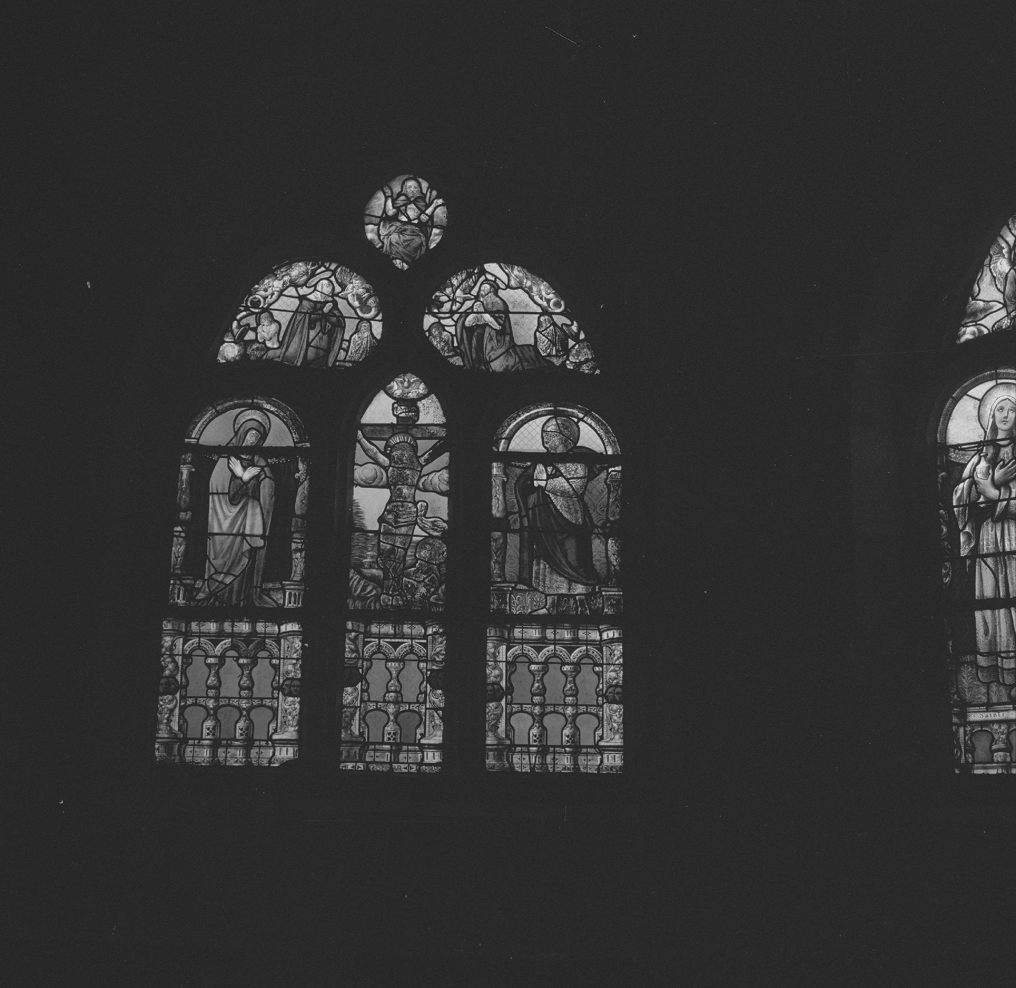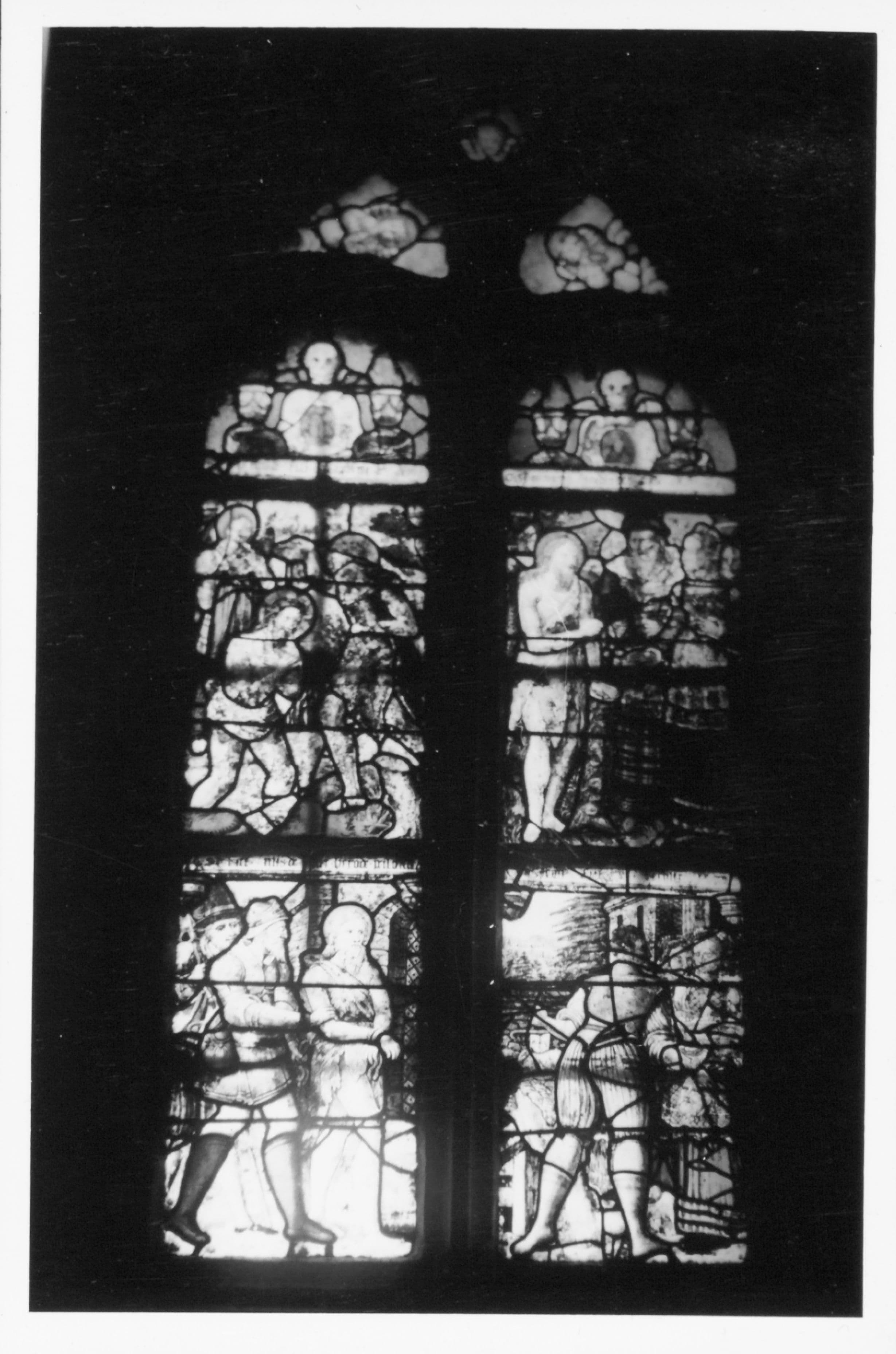 2 verrières : le Christ en croix, saint Jean-Baptiste baptisant le Christ, saint Jean-Baptiste emmené prisonnier par ordre d'Hérode, saint Jean-Baptiste sermonne Hérodiade et sont beau-frère tous deux richement vêtus, la Décollation de saint Jean-Baptiste