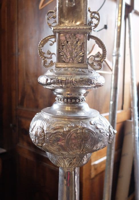 Les trois branches plates sont terminées par des têtes d'angelots rapportées et ajourées. Sur le noeud, décor repoussé à trois médaillons. Au-dessus du noeud, rangée de perles et grosse virole ornée d'un feuillage de lauriers. Au départ de la croix, ornementation de grandes palmettes repoussées, flanquée de motifs ajourés rapportés.