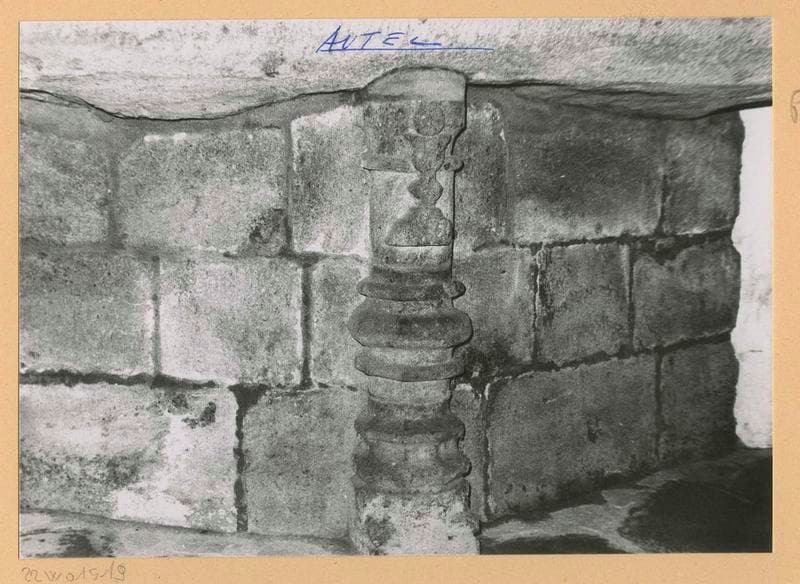 Autel en tau. La table est supportée par un massif de maçonnerie dont l'arête antérieure est formée d'une colonnette ornée à la partie supérieure d'un calice surmonté d'une hostie.