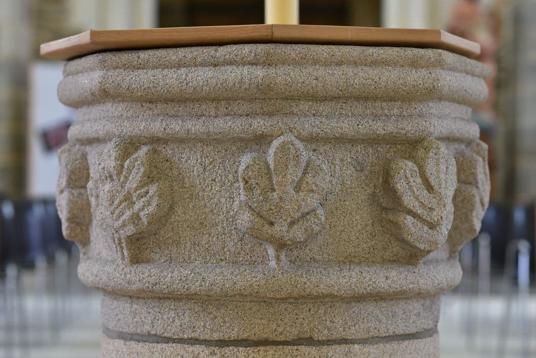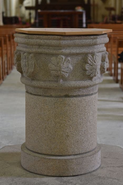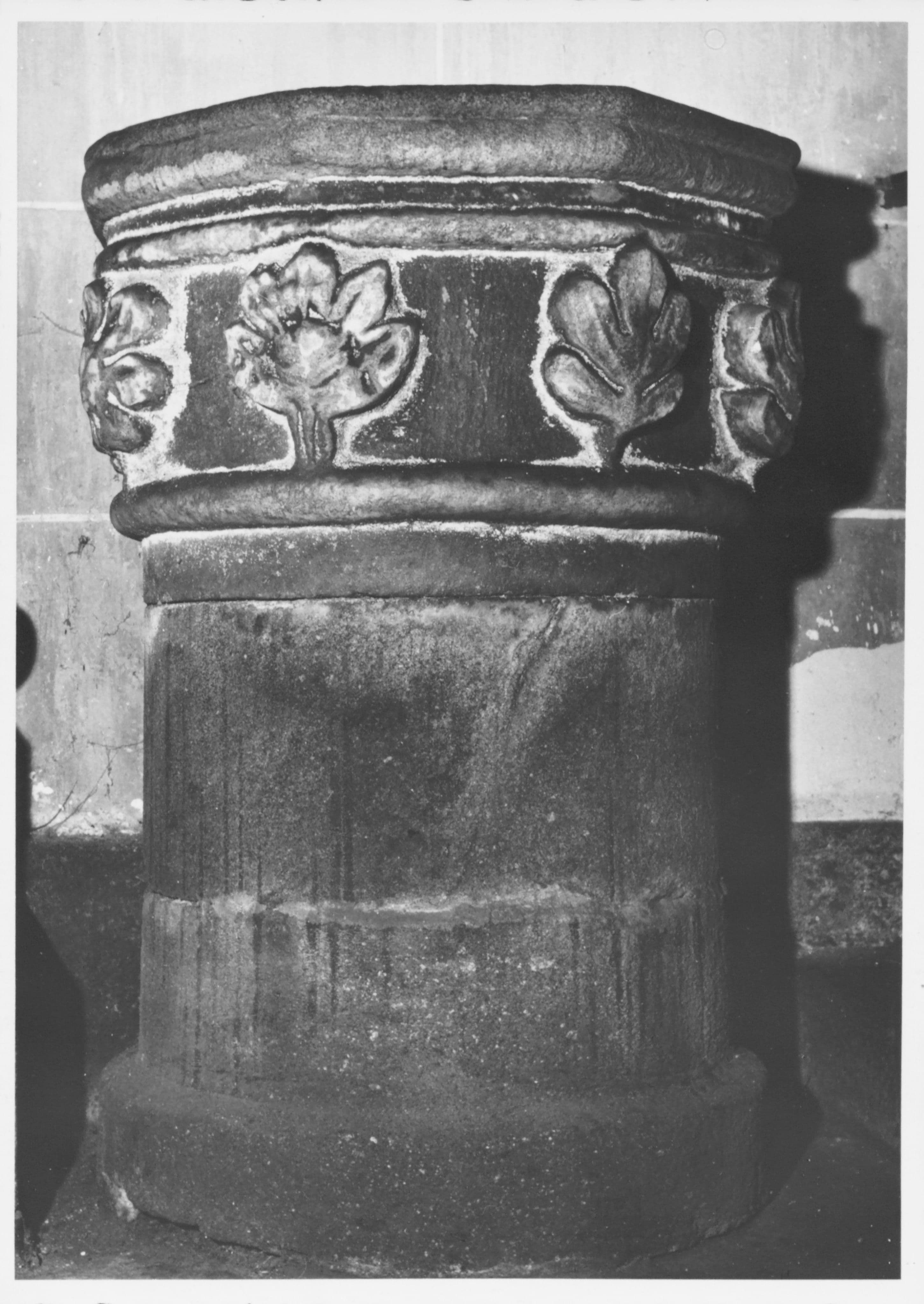 Le bord supérieur est octogonal. L'intérieur de la coupe est circulaire. Sur le flanc cylindrique et entre deux moulures, se rangent des feuilles sculptées en gros relief, chacune d'elles correspondant à un angle du couronnement. Le socle se compose de deux pièces.