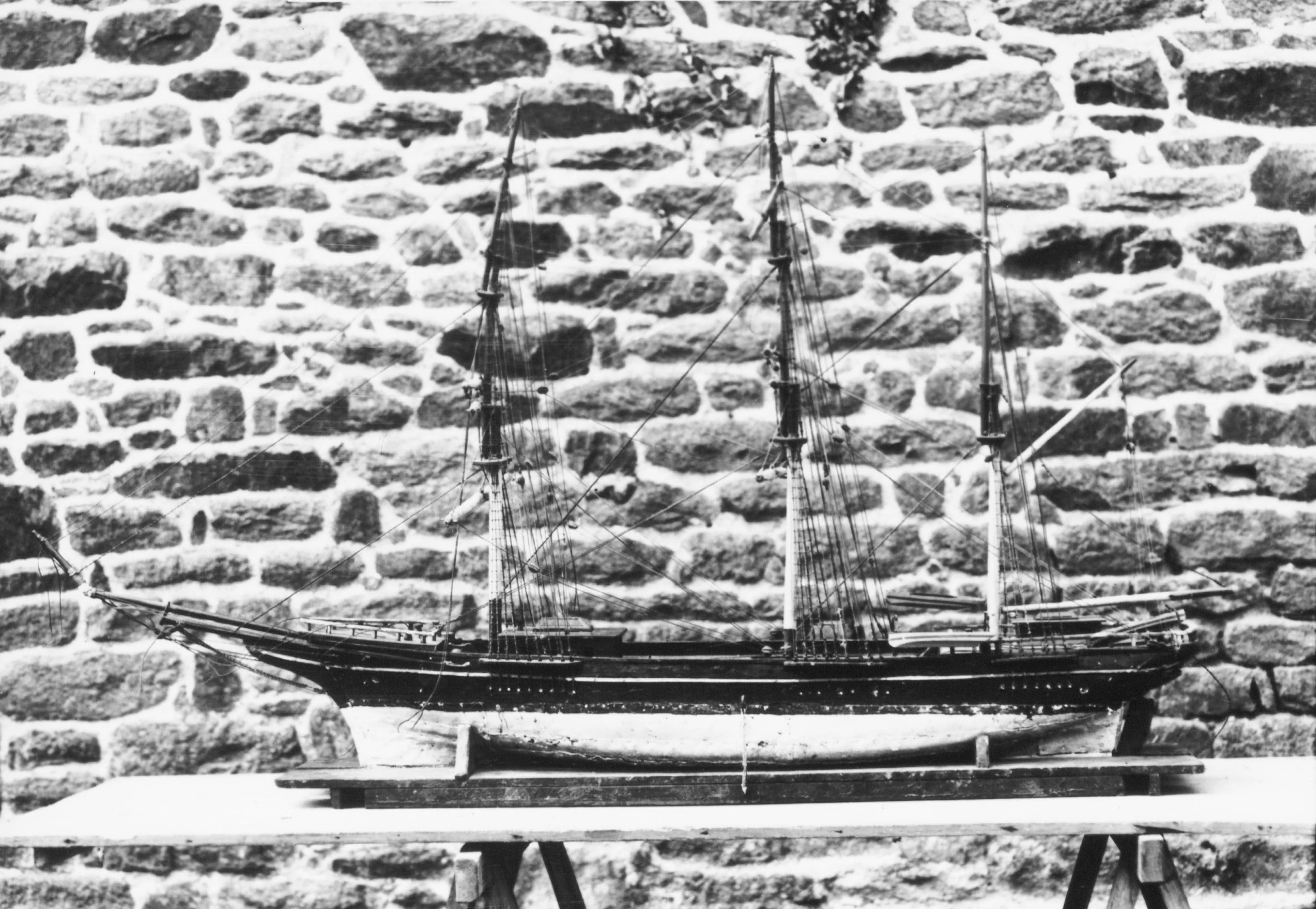 Bateau cap hornier offert par des marins du village de Mordreuc (?) après un naufrage. Trois mâts barque, bois doublé zinc, peitures grise, rouge et noire.