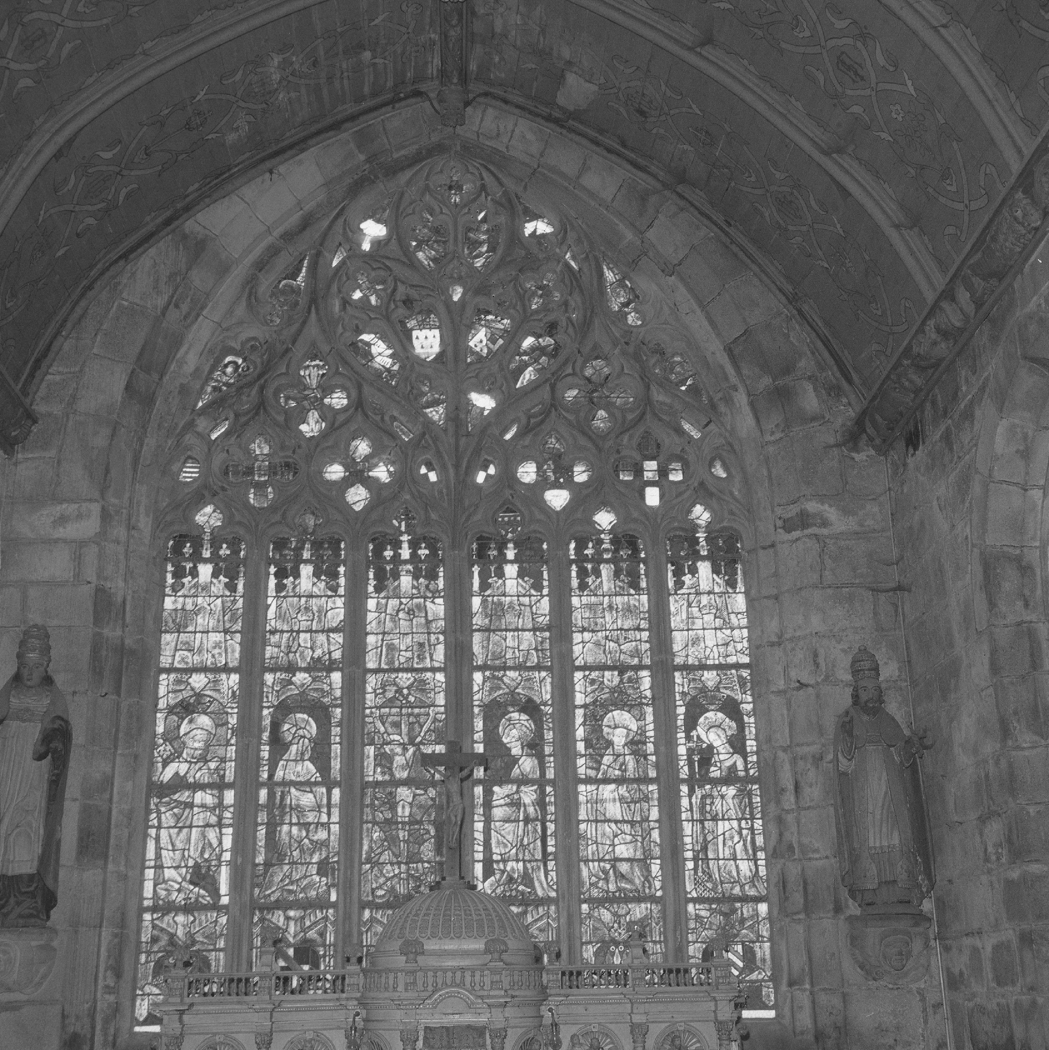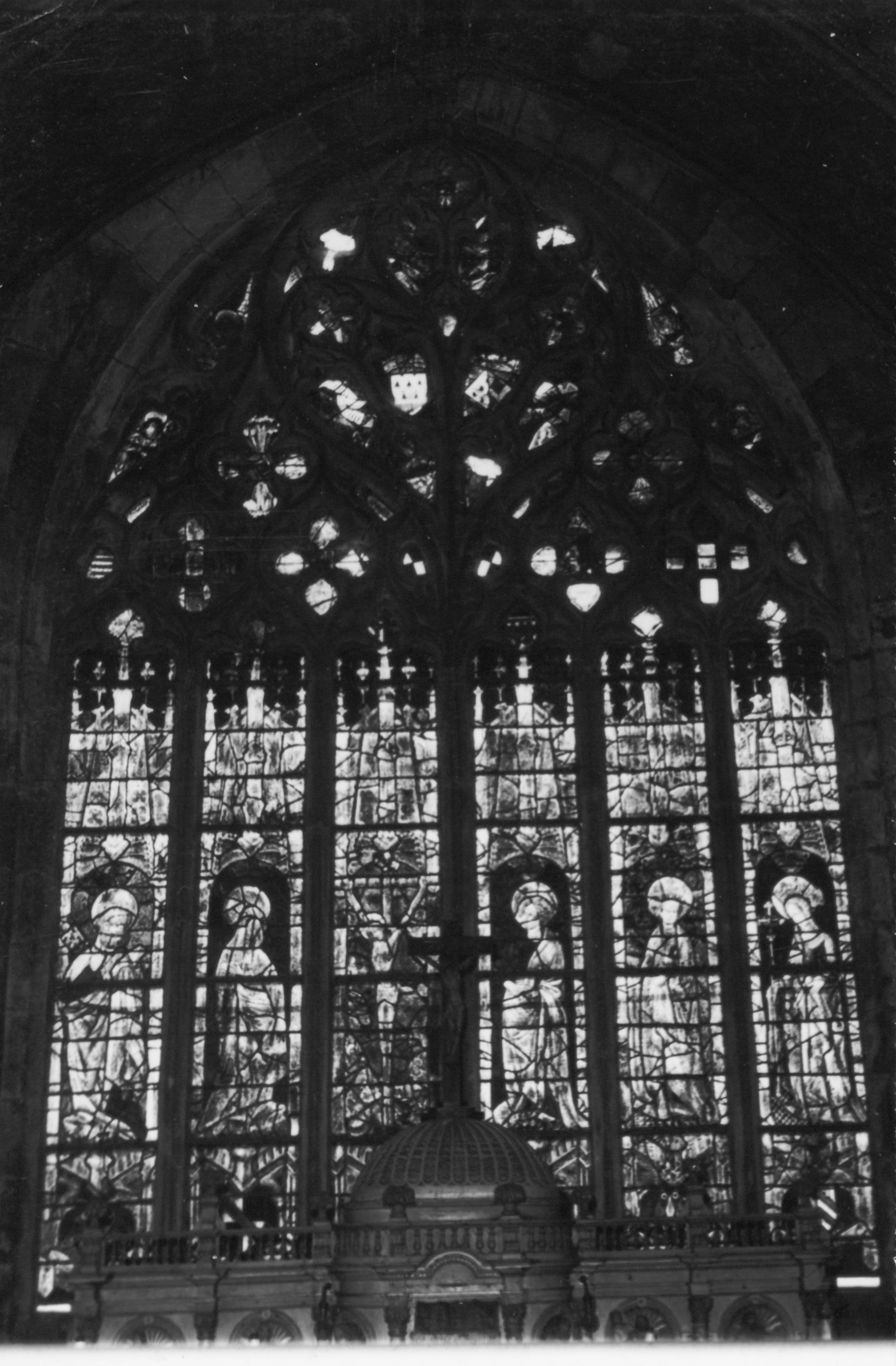 verrière : saint Pierre, Vierge (la), Christ en croix, saint Jean, sainte Catherine, sainte Hélène