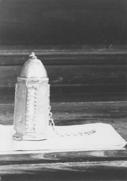 Petit reliquaire de forme octogonale ressemblant à une lanterne. Il est muni d'une chaînette.
