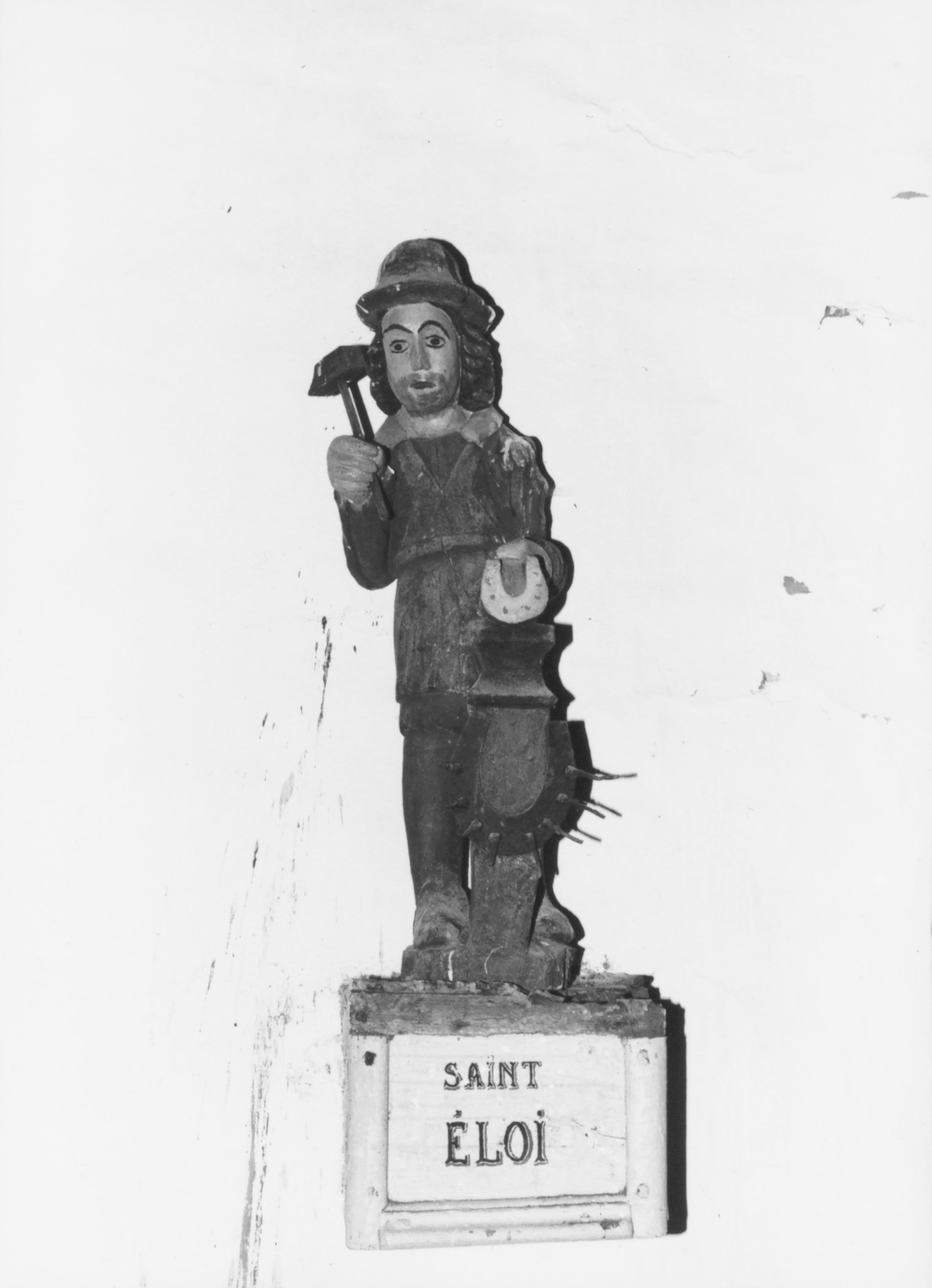 Saint Eloi est représenté debout. Sa main droite levée tenait sans doute un marteau aujourd'hui disparu. Sa main gauche pose une patte de cheval sur une enclume. Le pied de l'enclume est décorée par un fer à cheval muni de clous. Saint Eloi est vêtu d'une chemise à manches bouffantes, d'une culotte courte et de collants. Il porte un grand tablier à bretelles qui est probablement le tablier traditionnel des forgerons. Il est coiffé d'un chapeau à large bord.£Le style de cette sculpture est très populaire. L'attitude est statique et les traits sont peu expressifs. En revanche, ce type de représentation est original aussi bien par le choix des habits que par celui de reproduire fidèlement les outils et l'attitude des forgerons.