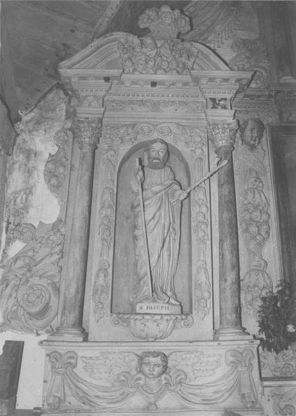 Antependium décoré de panneaux verticaux encadrés de pilastres corinthiens et d'un bandeau horizontal à rinceaux. retable composé d'un tableau central, de deux niches entre des colonnes composites couronnées de deux frontons surmontés de corbeilles de fruits.