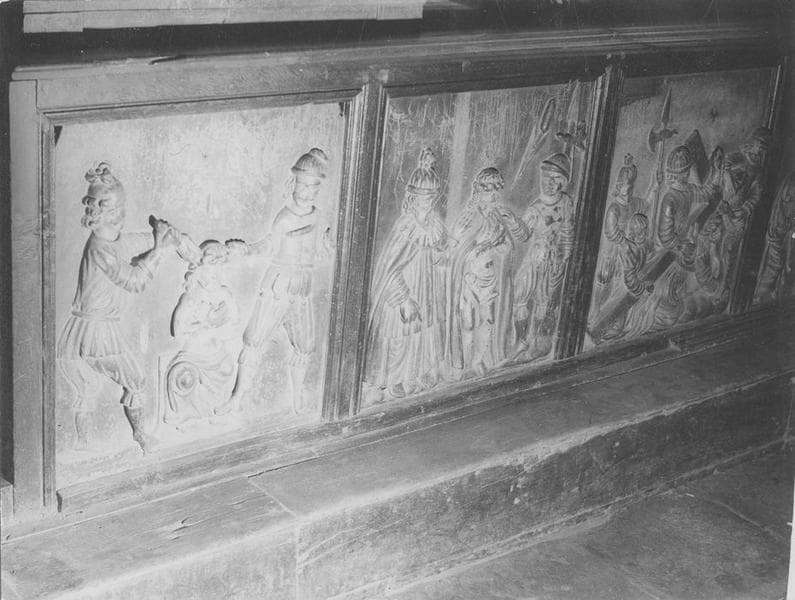 POP | Plateforme ouverte du patrimoineclôture de choeur : la Cène, Jésus au Jardin des oliviers, arrestation (l'), Jésus devant Anne, Jésus bafoué, Jésus devant Caïphe, Jésus devant Pilate, la Flagellation et le Couronnement d'épines, Ecce Homo, Jésus tombant sous la croix, la Crucifixion, la Résurrection