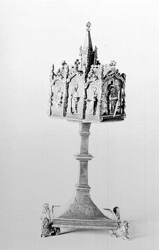 Reliquaire pédiculé. Petite caisse en forme d'église à une seule nef et à chevet carré, ornée sur chaque face de trois arcs ogives portés sur des colonnes en candélabre, toit à crête et clocher central. Le reliquaire est posé diagonalement sur une tige rectangulaire, interrompue par une moulure, sortant d'un pied en doucine, porté sur quatre lions.