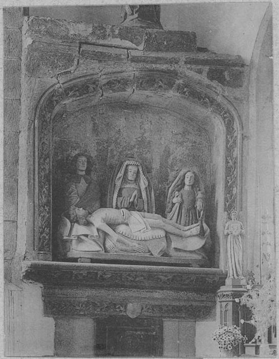 Le Christ est allongé sur les genoux de la Vierge, de saint Jean et de Marie-Madeleine. La Vierge a les mains jointes, saint Jean les mains cachées sous son manteau, sainte marie-Madeleine porte un linge en main dextre et le vase de parfum en main senestre. Au dessus-de cette mise au tombeau se trouve une statue de la Vierge de pitié.