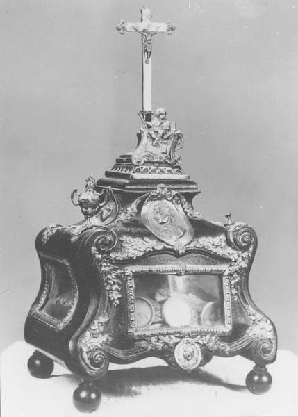 Quatre boules portent le reliquaire, à quatre faces vitrées, dont la forme galbée est accusée par les deux consoles qui ornent le devant. Les ornements d'argent comprennent les entourages des logements vitrés, quatre médaillons, des guirlandes de feuillages, une urne sur le dessus (une autre a disparu). Le sommet du reliquaire porte un soubassement sur le quel est un motif en argent.