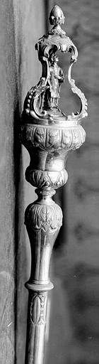 Le bâton, décoré d'oves, de palmettes et de feuillages, se termine par un petit lanternon à trois consoles qui abrite une statuette.