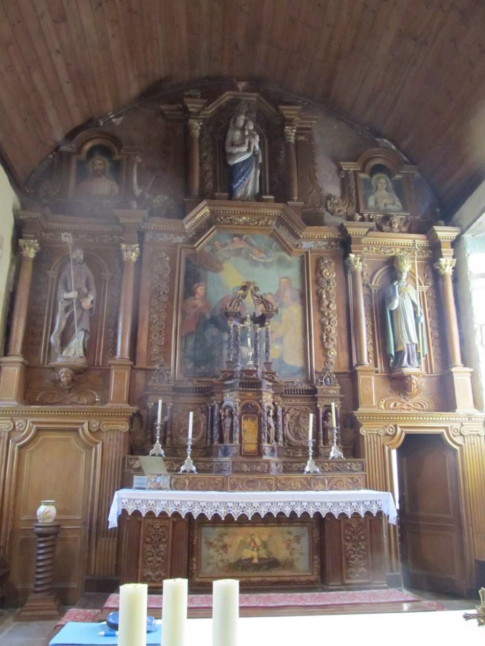 Autel surmonté de deux gradins. Tabernacle polygonal. Colonnes torses aux angles. Deux panneaux latéraux sculptés avec colonnes cylindriques. Entablement, volutes, rinceaux, fuseaux. retable à deux étages : 3 panneaux au 1er étage, puis un entablement, puis 3 panneaux au 2e étage.