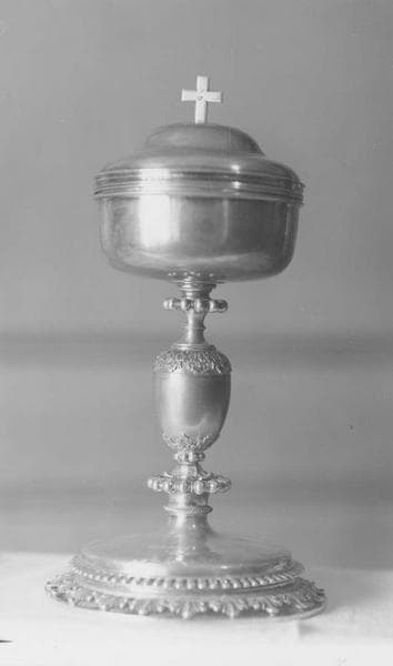 Base repercée. Noeud uni à deux bandes de feuilles de culots. Collerettes perlées. Couvercle à charnière.