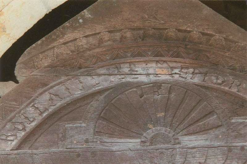 Au-dessus des quatre panneaux inférieurs, sont placés trois panneaux sculptés en bas-relief.