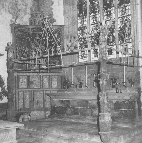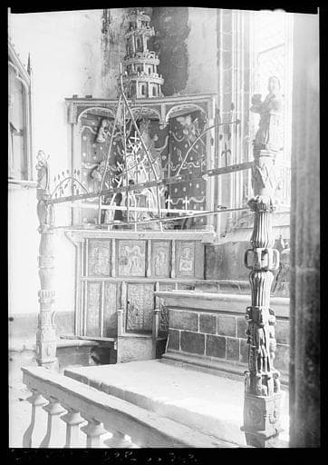Baldaquin supporté par deux colonnes en bois sculpté. Le dais proprement dit se compose de deux barres de fer parallèles qui prennent appui sur les colonnes et sur le mur du chevet. Au-dessus de la barre supérieure se dressent trois frontons triangulaires. Chaque fronton est accosté, à droite et à gauche, d'une tige de fer incurvée à fleurs de lys.