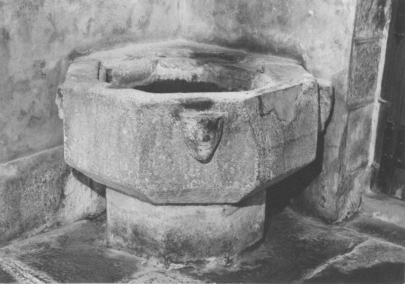 Ancienne cuve baptismale sur un pédicule très court. Bloc octogonal avec 4 mascarons au pourtour.
