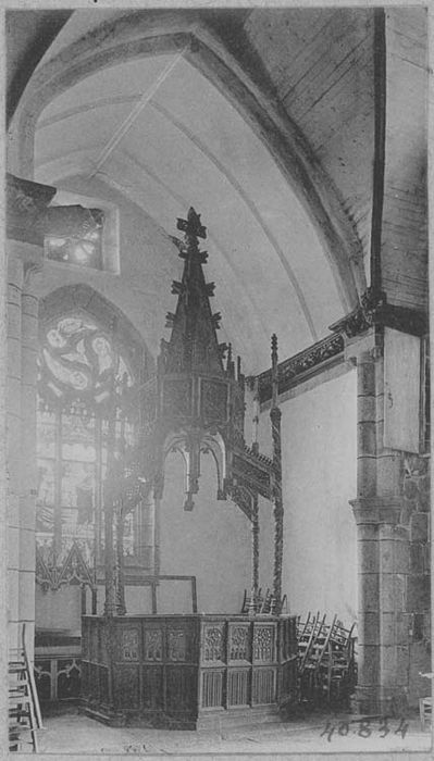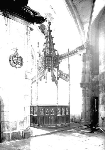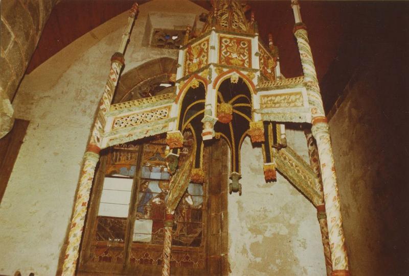 Baptistère de forme octogonale. Chaque côté est orné de trois panneaux décorés de fenestrages gothiques. Il est surmonté d'un dais à pinacle, porté par quatre colonnettes torses.