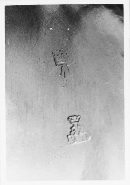Poinçon de communauté : lettre A couronnée : Paris, du 10 avril 1669 au 11 juillet 1670 (sur la coupe et le pied). Poinçon de maître : lettres PD séparées par une fleurette, au-dessus, une fleur de lys couronnée entre deux grains de remède (sur la coupe et le pied)