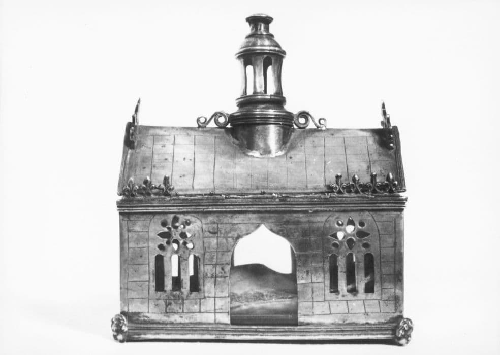 Reliquaire en forme de maison, avec lanterne centrale engagée dans le toit, surmontée d'un petit dôme.