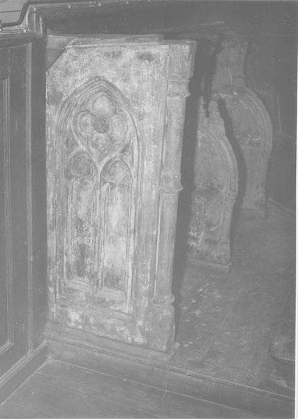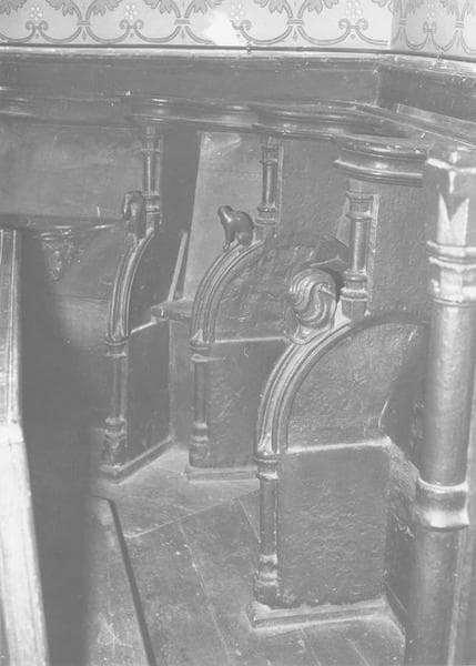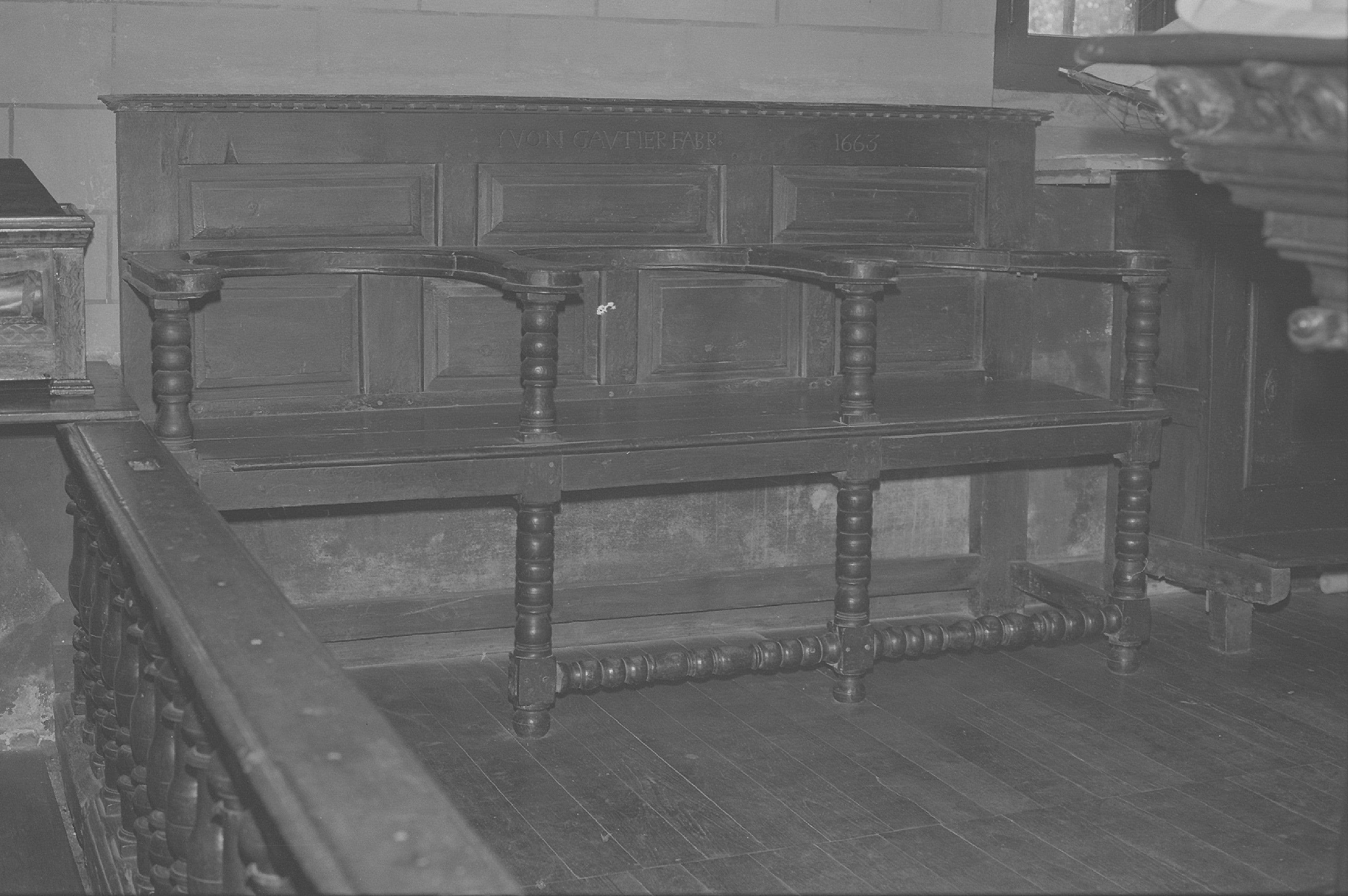 Stalles (2). Banc à trois places. Pieds et entretoises tournées. Supports d'accoudoirs tournés. dossier plat. Places séparées par des accoudoirs rattachés au dossier et découpés en demi-cercle.