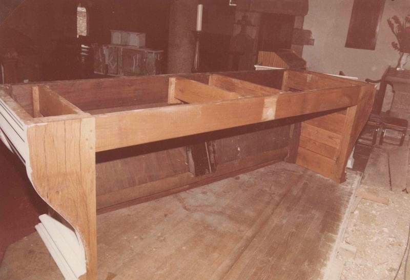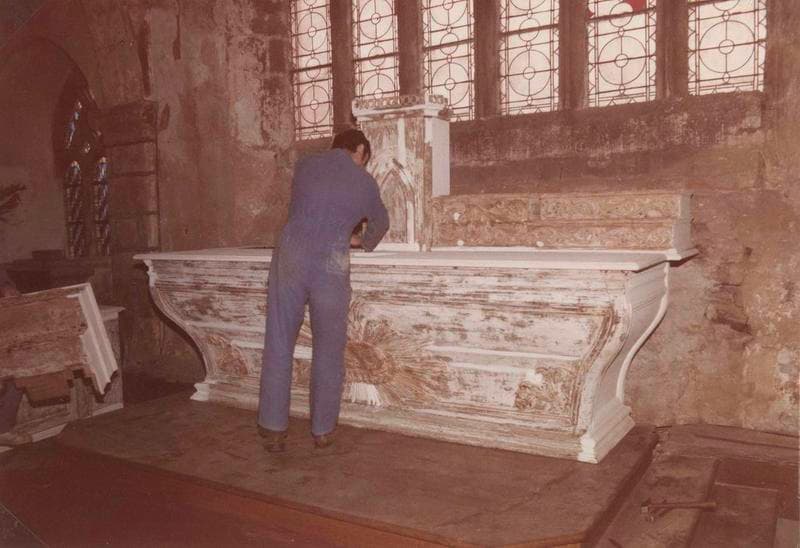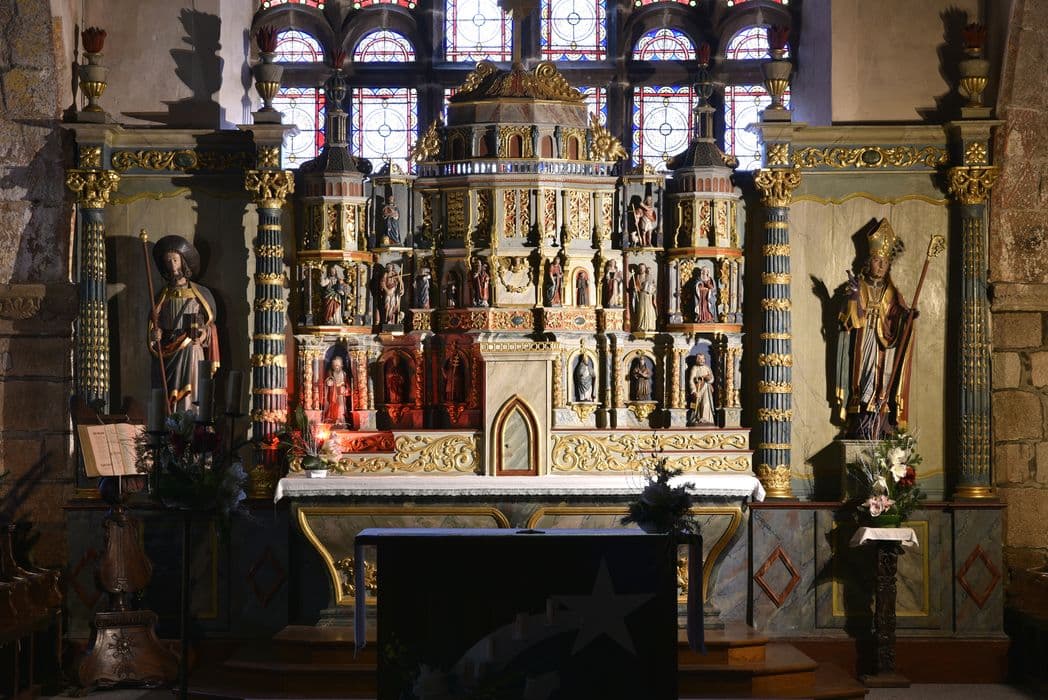 Au centre, un tabernacle polygonal surmonté d'un édicule s'élevant jusqu'au sommet du retable et surmonté d'un dôme. Les faces sont ornées de niches, de statuettes et de petits panneaux sculptés. panneaux latéraux comportant trois étages de niches à statuettes. Toutes les niches et les panneaux sont ornés de colonnettes et de motifs floraux finement sculptés. Les niches latérales sont encastrées de colonnes, surmontées d'un entablement amorti de pots à feu.