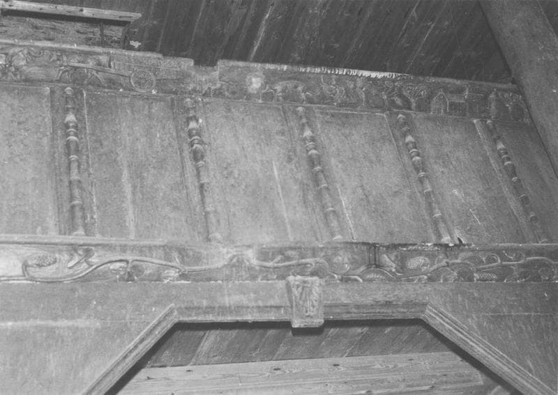 Tribune avec une balustrade composée de 14 panneaux séparés par des rinceaux.