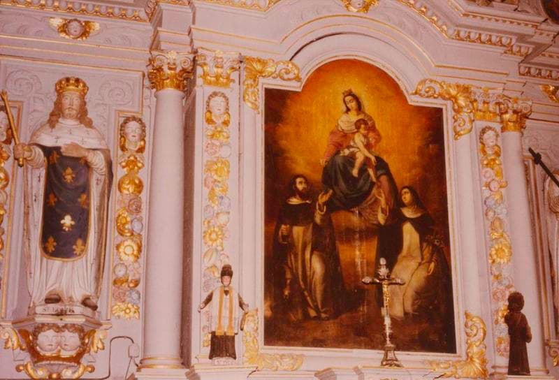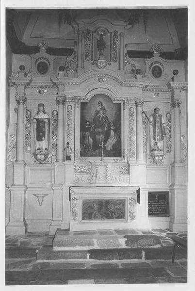 Retable comprenant quatre colonnes, un entablement curviligne au centre, trois frontons surmontés de paniers fleuris. A droite du contre-table, une plaque commémorative.