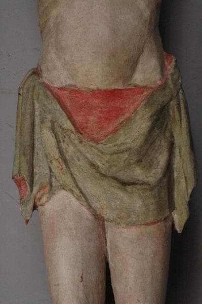 Le Christ est représenté crucifié sur la croix. Son visage émacié aux yeux clos est encadré d'une mince barbe et des longues mèches de sa chevelure ondulée. Il porte la couronne d'épines, il est vêtu d'un périzonium vert au revers rouge.