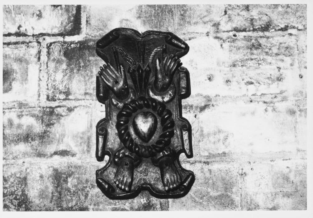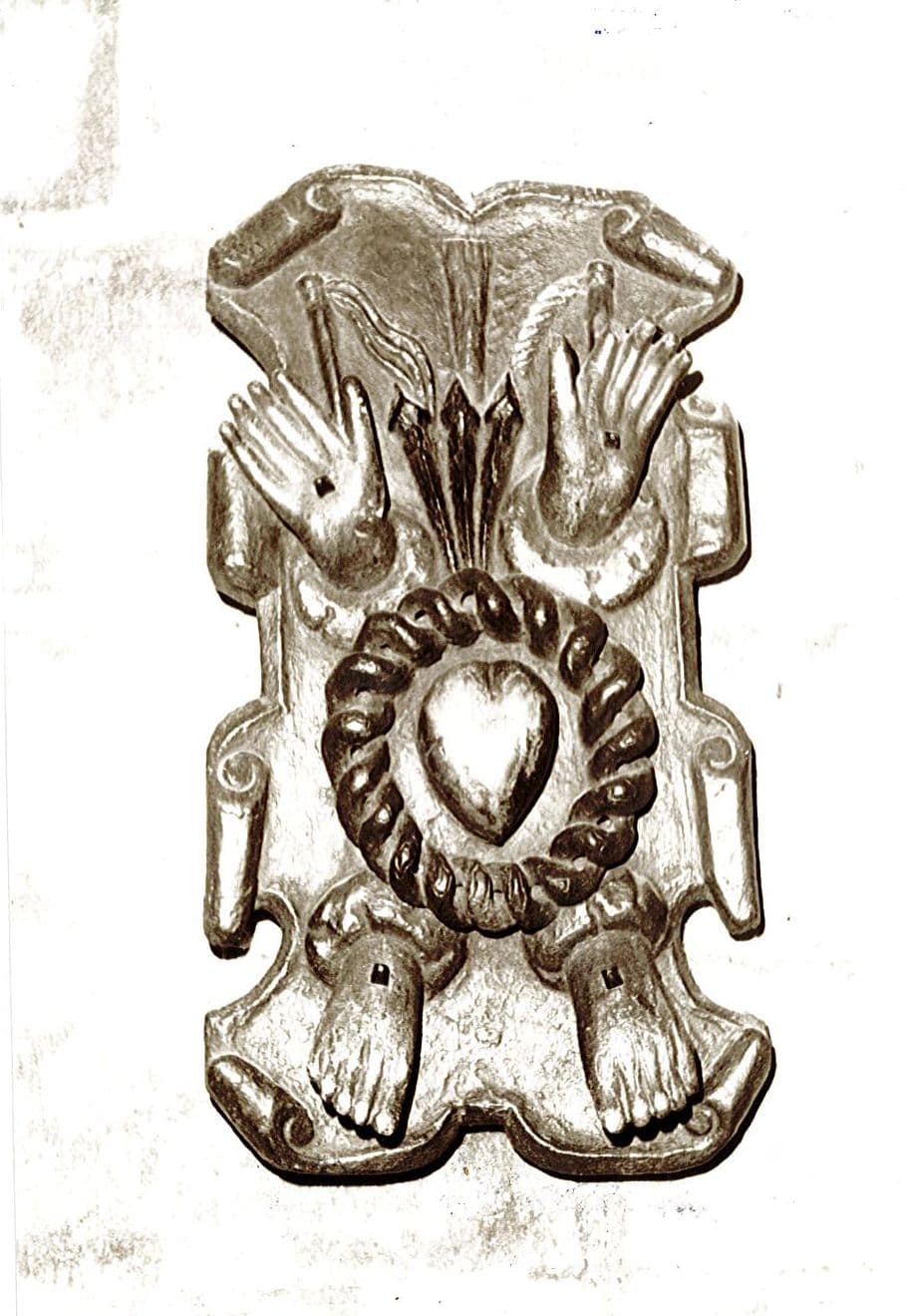 stigmates : main, pied ; Instrument de la Passion : La couronne d'épines, Les clous ; coeur ; Sacré-Coeur ; fouet