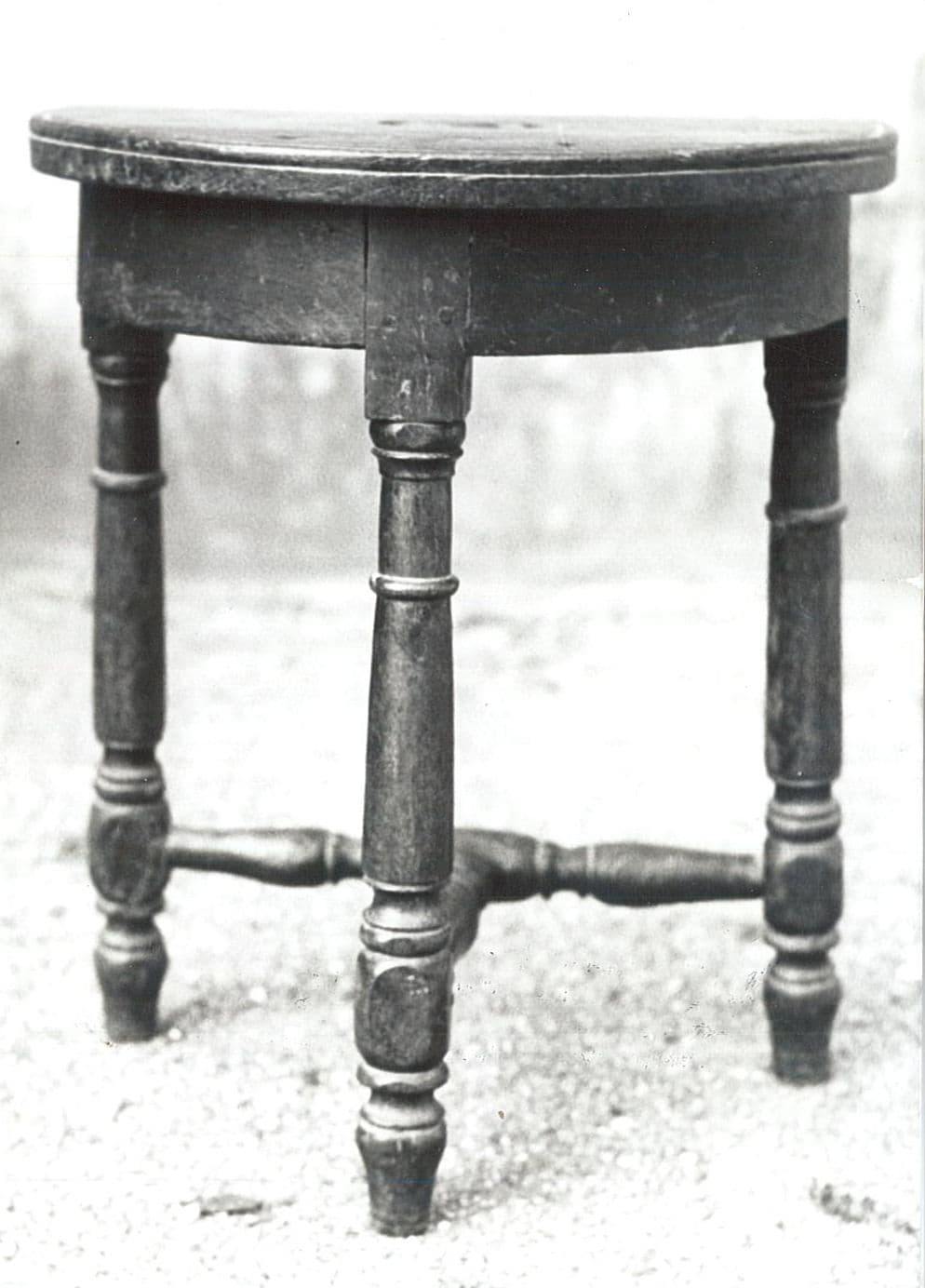 Tablier semi-circulaire avec trou de préhension au centre. Trois pieds avec moulure, reliés par des entretoises.