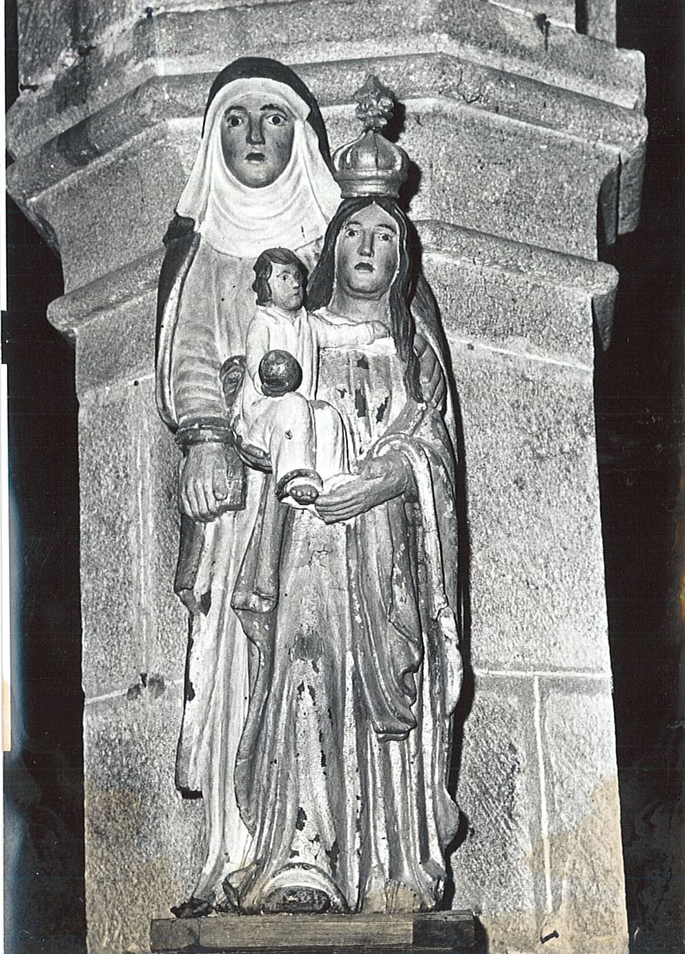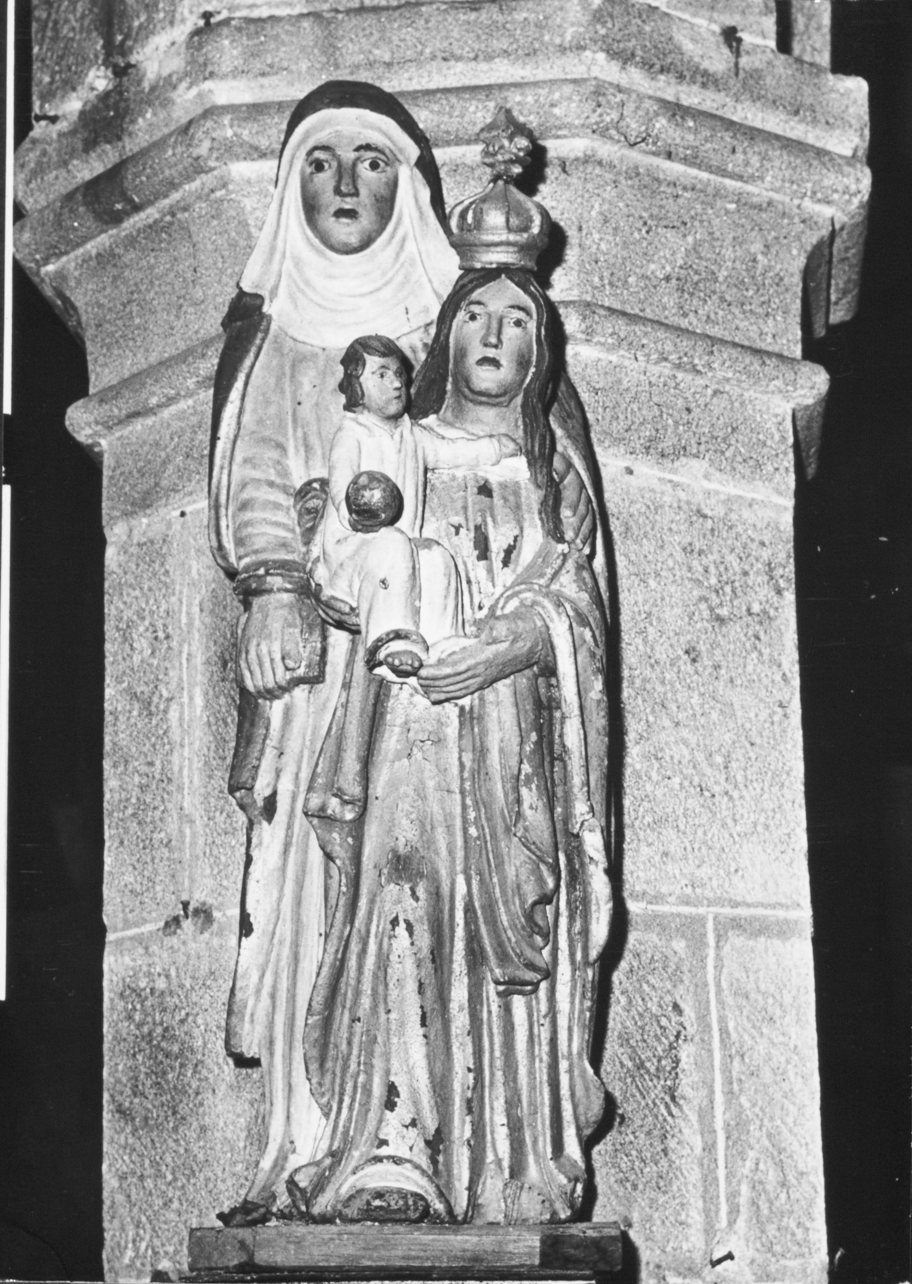 sainte Anne trinitaire : livre, guimpe ; Vierge : couronne ; Enfant Jésus : globe