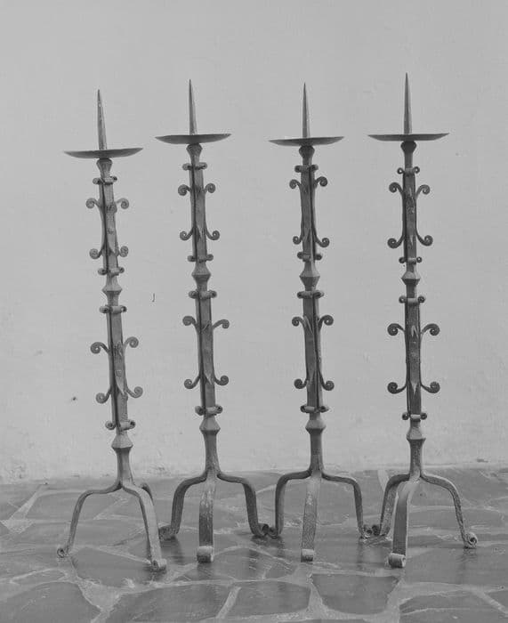 Ces chandeliers tripodes se composent d'une tige ornée de volutes et de collerettes, et de larges bobèches évasées.