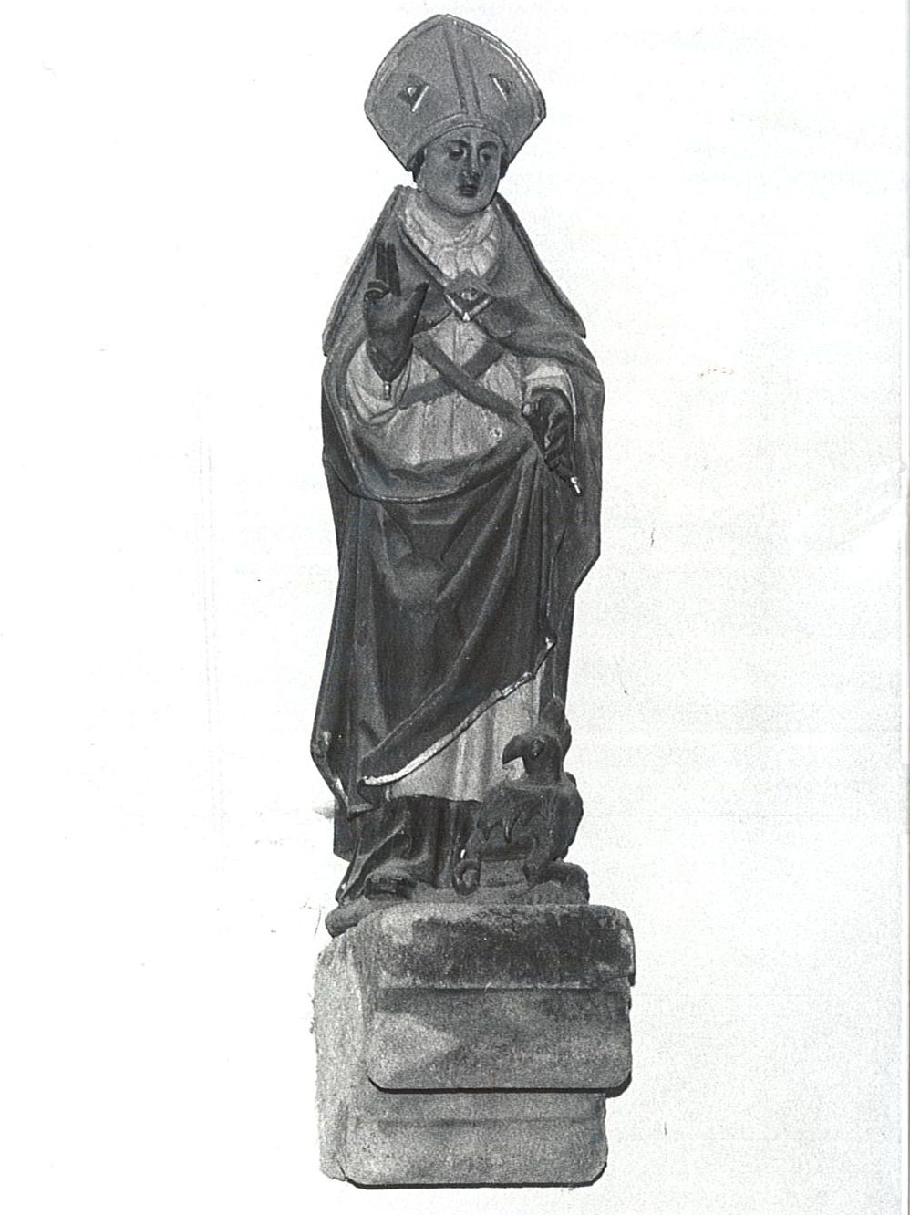 Le saint, en costume d'évêque, porte la mitre et bénit de la main droite, tandis qu'il foule aux pieds un petit dragon.