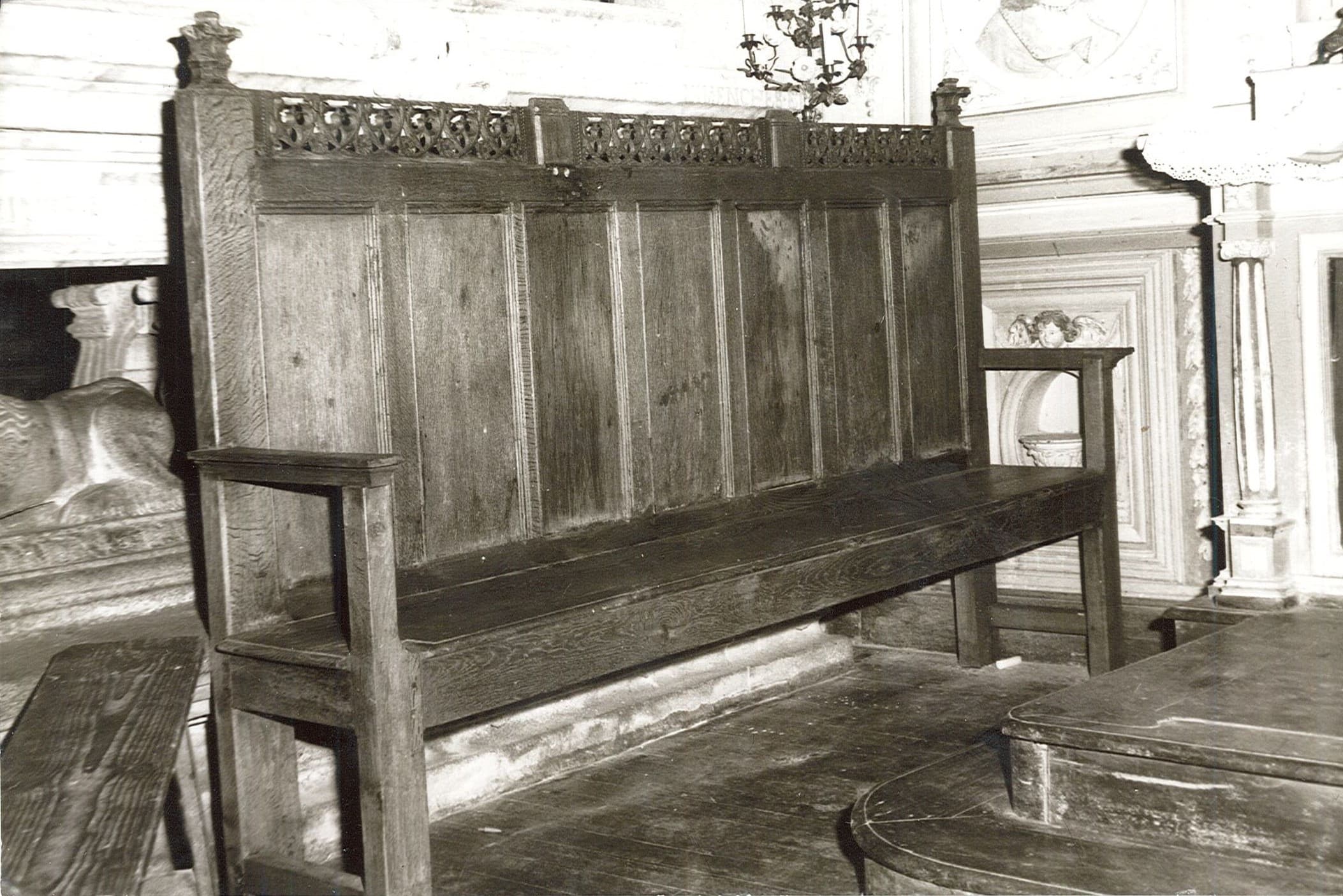 Banc à accoudoirs et haut dossier. Ce dernier est divisé en sept panneaux et présente à ses extrémités supérieures deux fleurons, entre lesquels court une frise ajourée gothique à fleurs et feuillages.