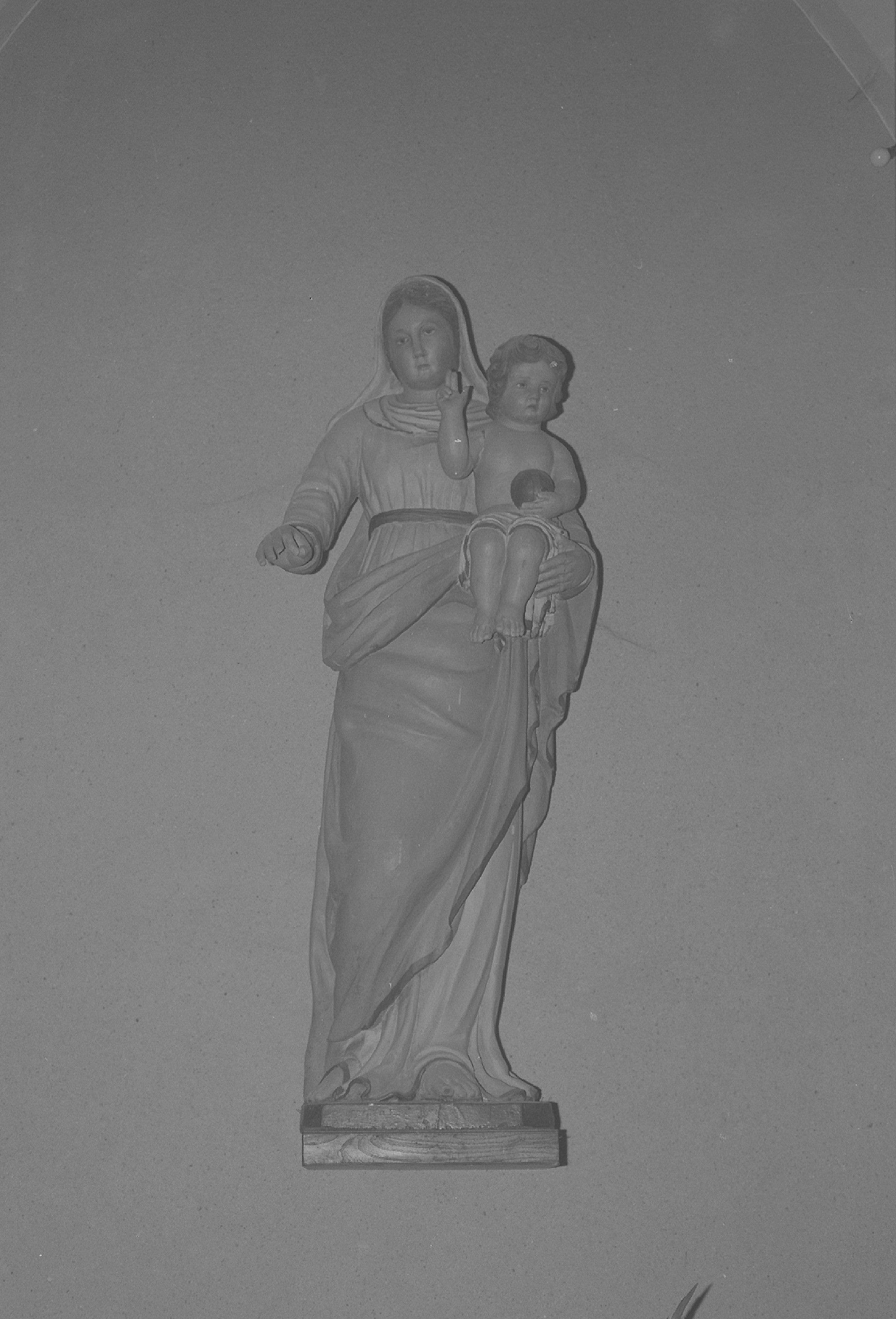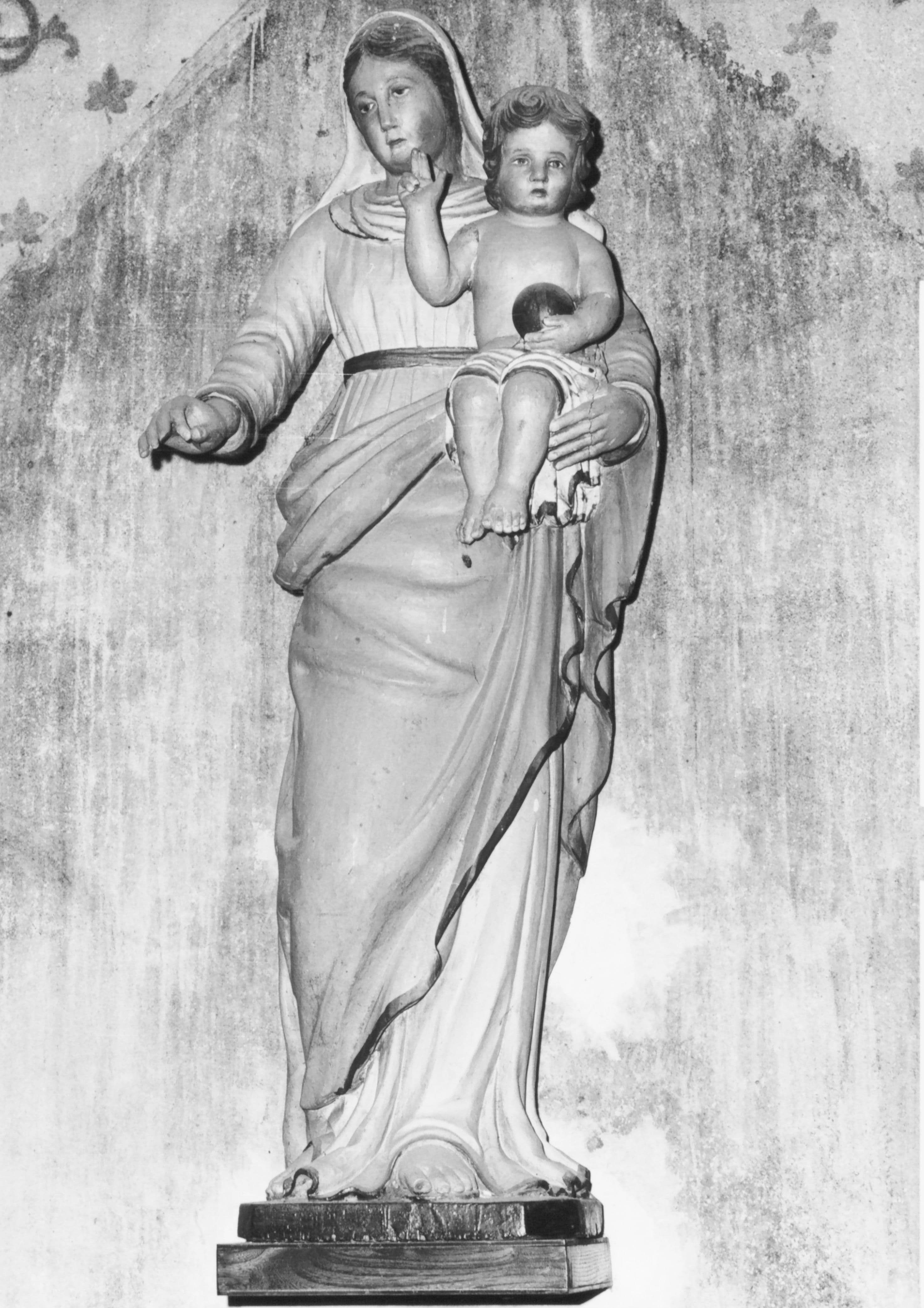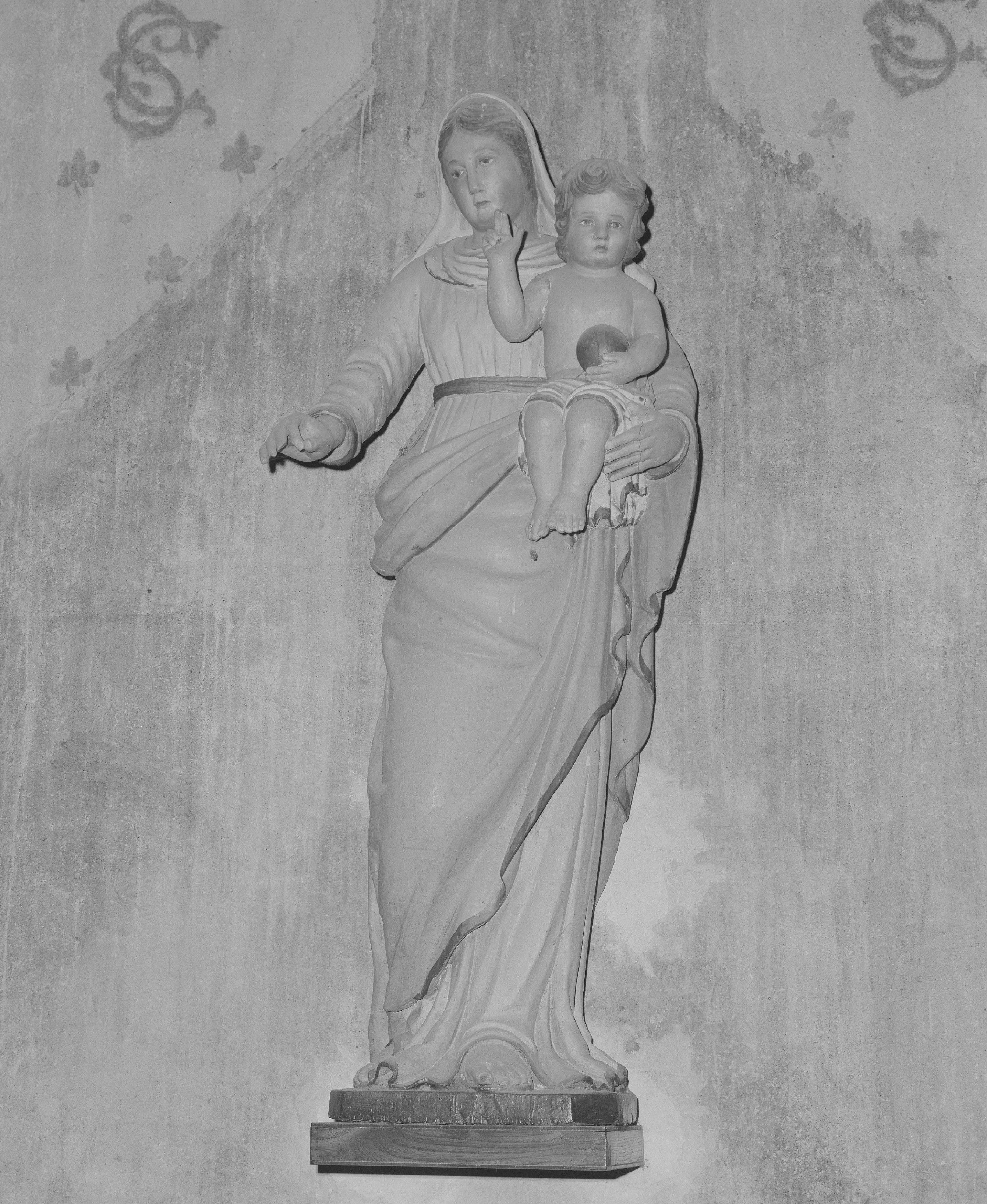 La Vierge, voilée, se tient debout et tend la main droite dans laquelle elle devait tenir un attribut aujourd'hui disparu. Elle porte l'Enfant Jésus sur le bras gauche. Celui-ci tient le globe de la main gauche et bénit de la main droite.