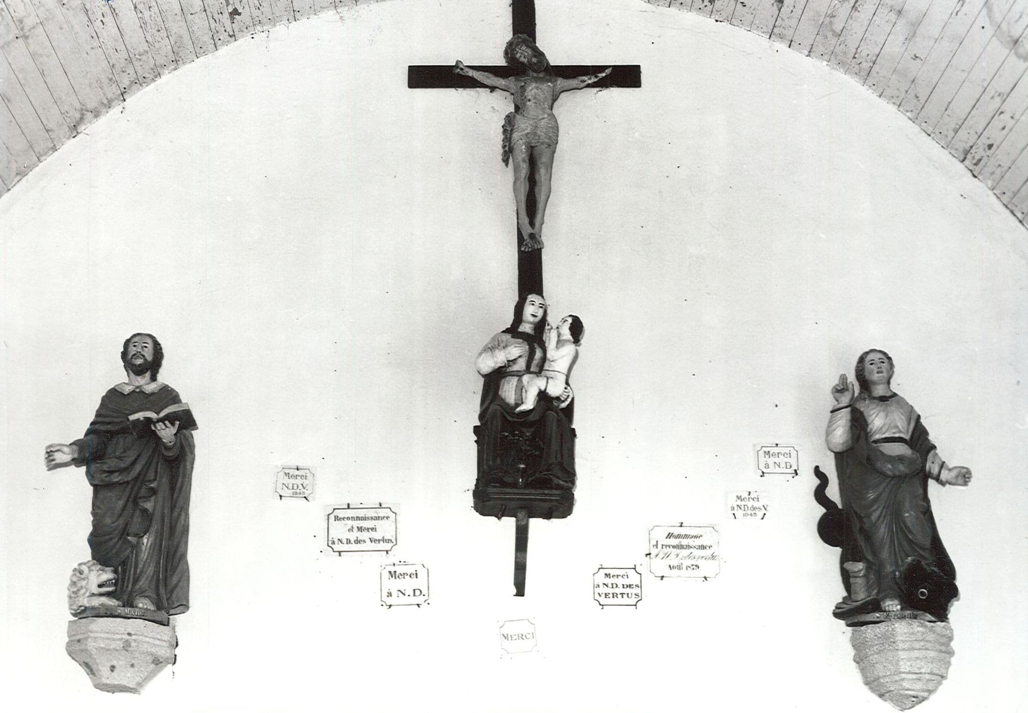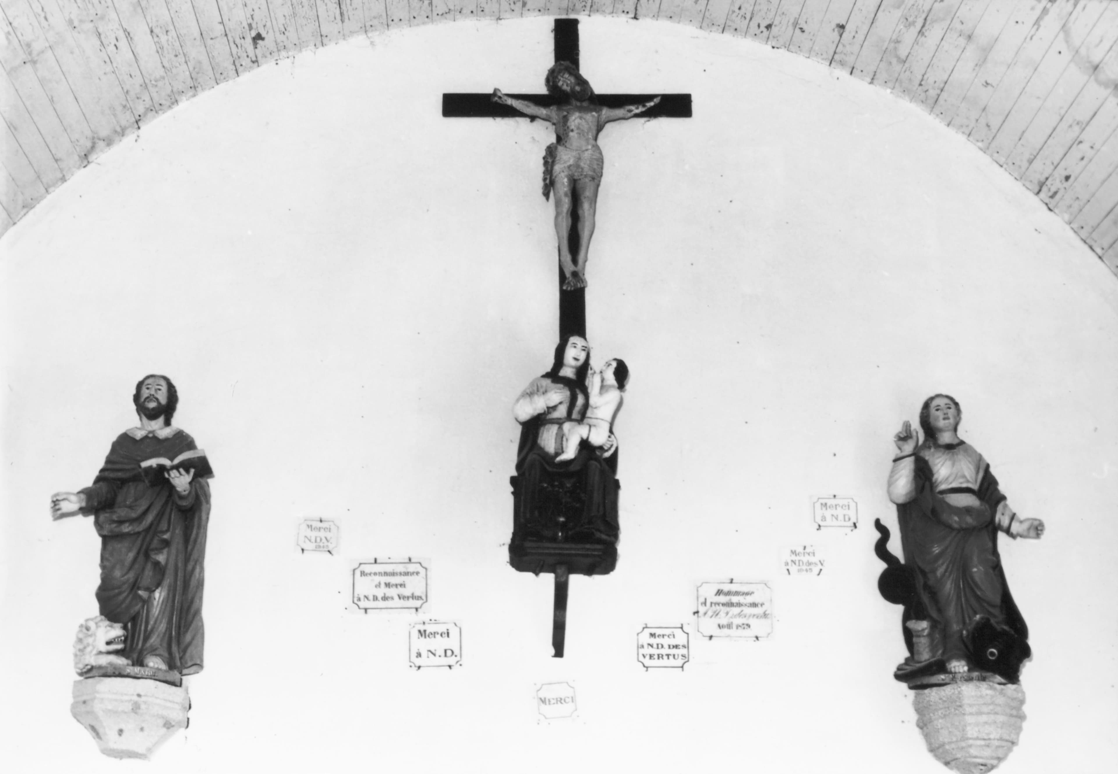 quatre statues : Christ en croix, Vierge à l'Enfant, Saint Marc et Sainte Marguerite