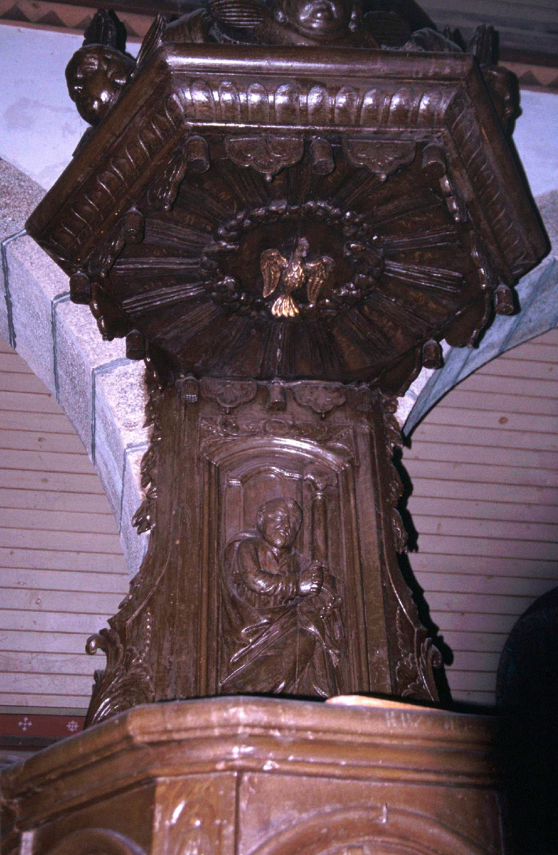 Les panneaux de la cuve et de l'escalier sont peints des représentations des quatre évangélistes et des prophètes. L'abat-voix est bordé de petits éléments de bois pendants semblables à des bannières ornées de fleurs ; sous celui-ci, est sculpté un motif rayonnant. Au sommet de la chaire se tient une Renommée sonnant une trompette de la main droite et en tenant une seconde dans l'autre main.