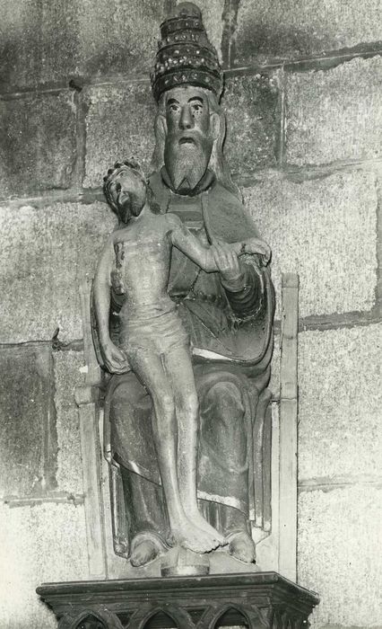 Dieu le Père assis, coiffé d'une tiare, porte le corps du Christ souffrant, au canon très allongé, sur ses genoux. Il le maintient de la main droite et soutient son poignet de la main gauche. La représentation du Saint-Esprit a peut-être disparu (voir notice de l'inventaire).