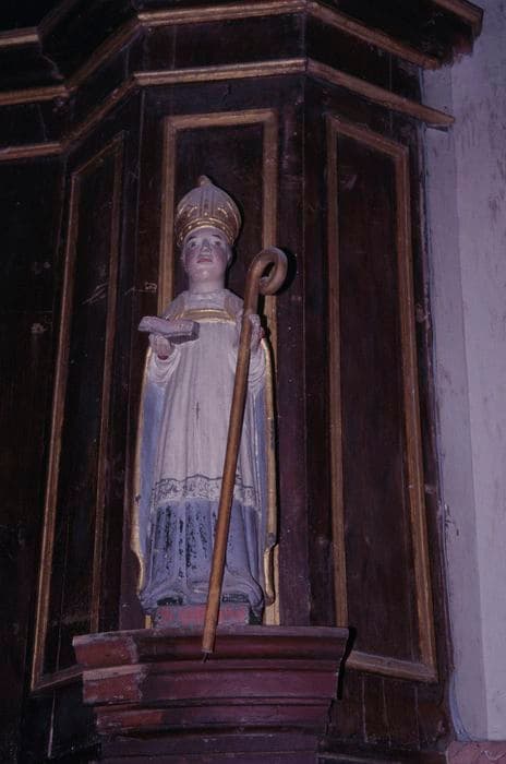 Le saint en habit d'évêque, coiffé d'une mitre à soufflet ornée d'un bouton, tient une crosse dans la main gauche et un livre ouvert dans la main droite. Son costume épiscopal se compose d'une soutane, d'un surplis avec une chape à patte agrafée.