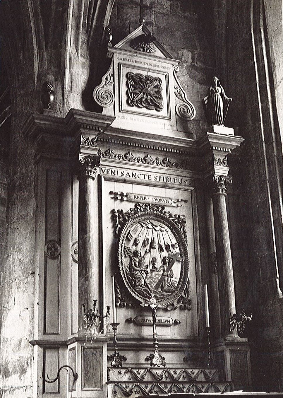 Inscription (sur le fronton) : GABRIEL DESCENDS DES CIEUX VERS MARIE DIRIGE TES PAS ; inscription (sous la frise de l'entablement) : VENI SANCTE SPIRITUS ; inscription (au-dessus et en-dessous du médaillon) : REPLE TUORUM, CORDA FIDELIUM.