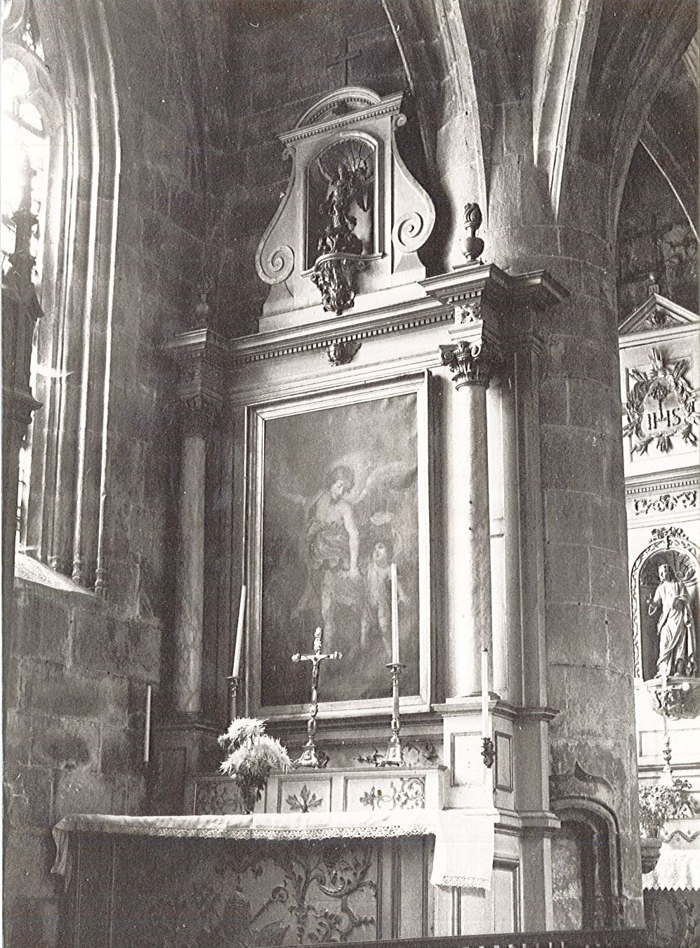 Le retable offre, entre deux colonnes, un tableau central représentant l'Ange gardien. Au-dessus de celui-ci, on distingue une tête d'angelot. Le fronton, surmonté d'une croix latine, abrite une niche contenant une statuette de saint Michel. Deux pots à feu reposent sur l'entablement.